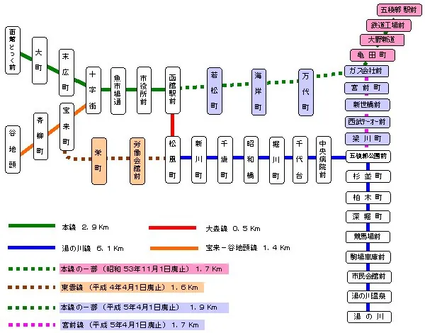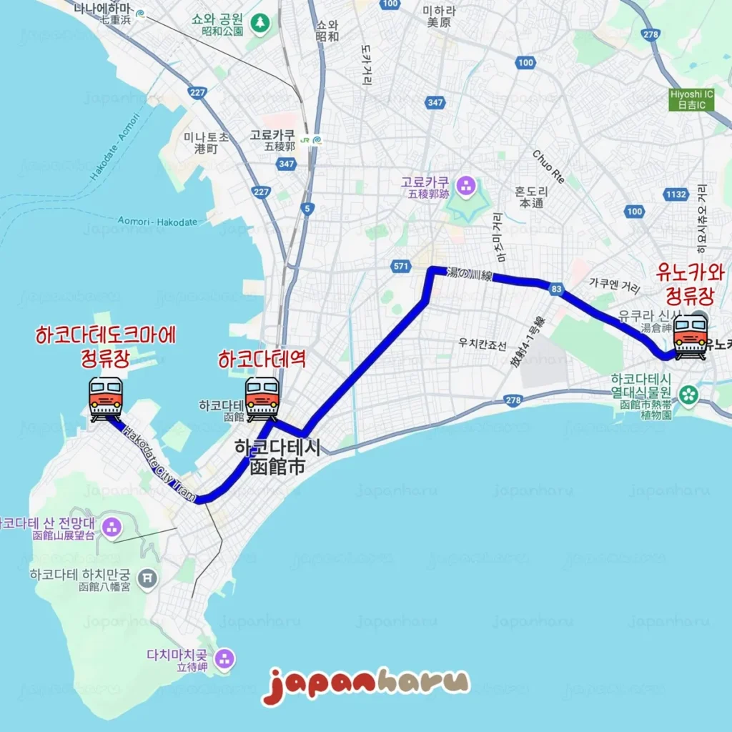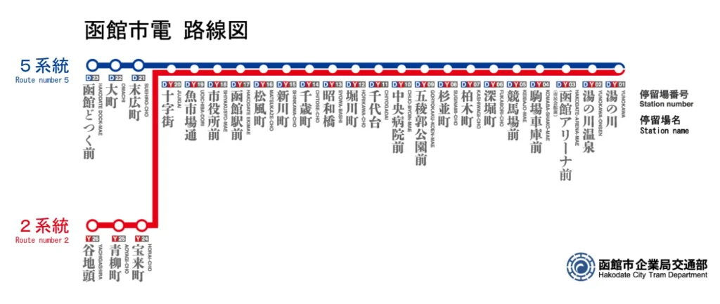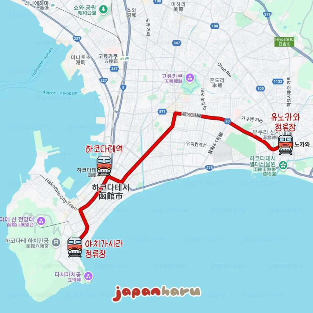 2개 노선의 구간 중에서 북동쪽의 유노카와에서 하코다테역 앞의 ‘하코다테에키마에’ 정류장을 지나 ‘주지가이’ 정류장까지는 동일해요.