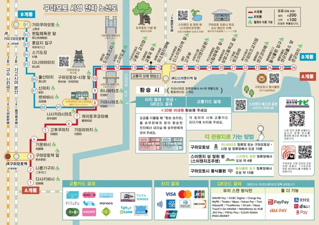 만약 신칸센을 타고 후쿠오카 또는 가고시마에서 구마모토로 오거나 반대로 신칸센을 타고 후쿠오카나 가고시마로 가려면 시내에서는 빨간색 노선인 A계통을 타야 해요.