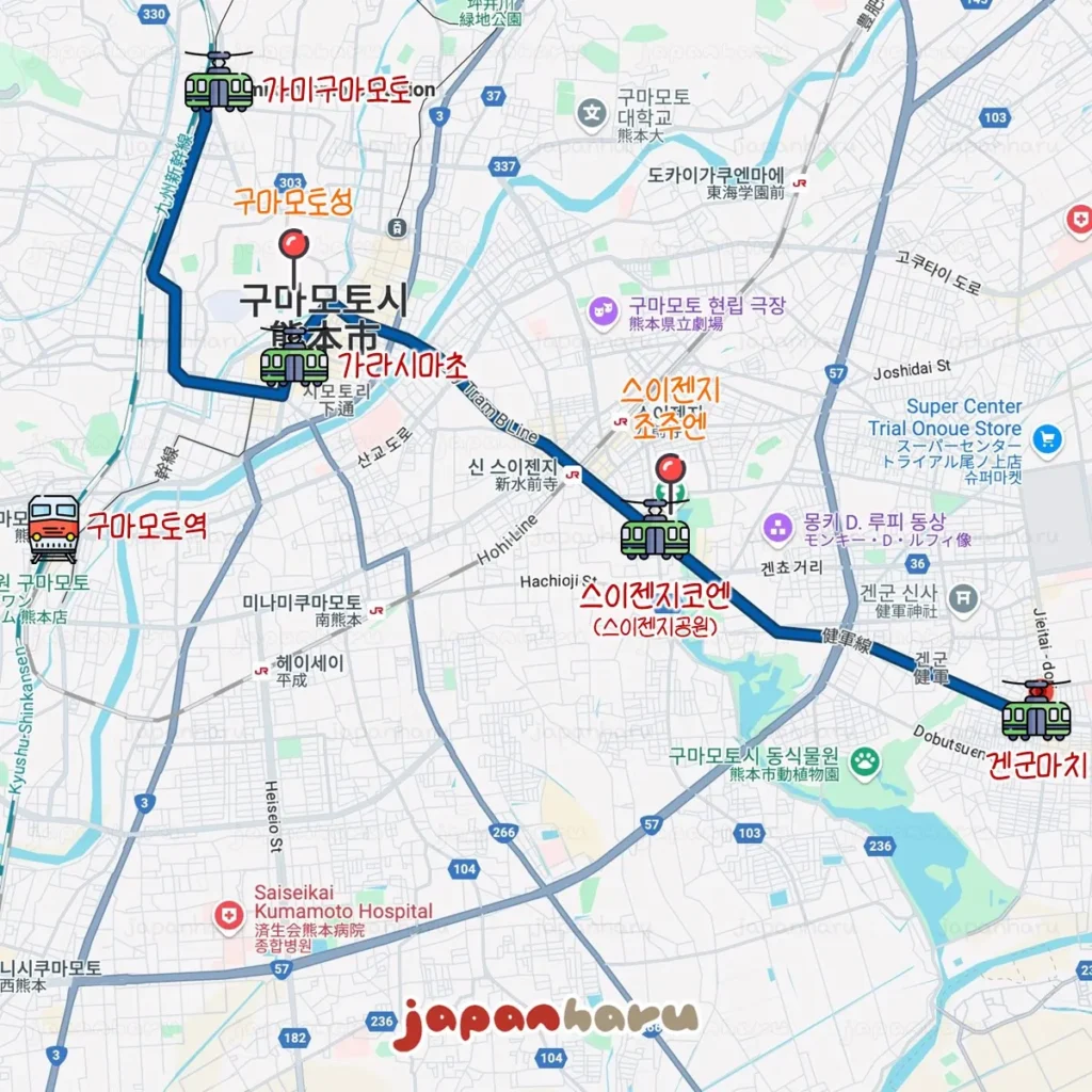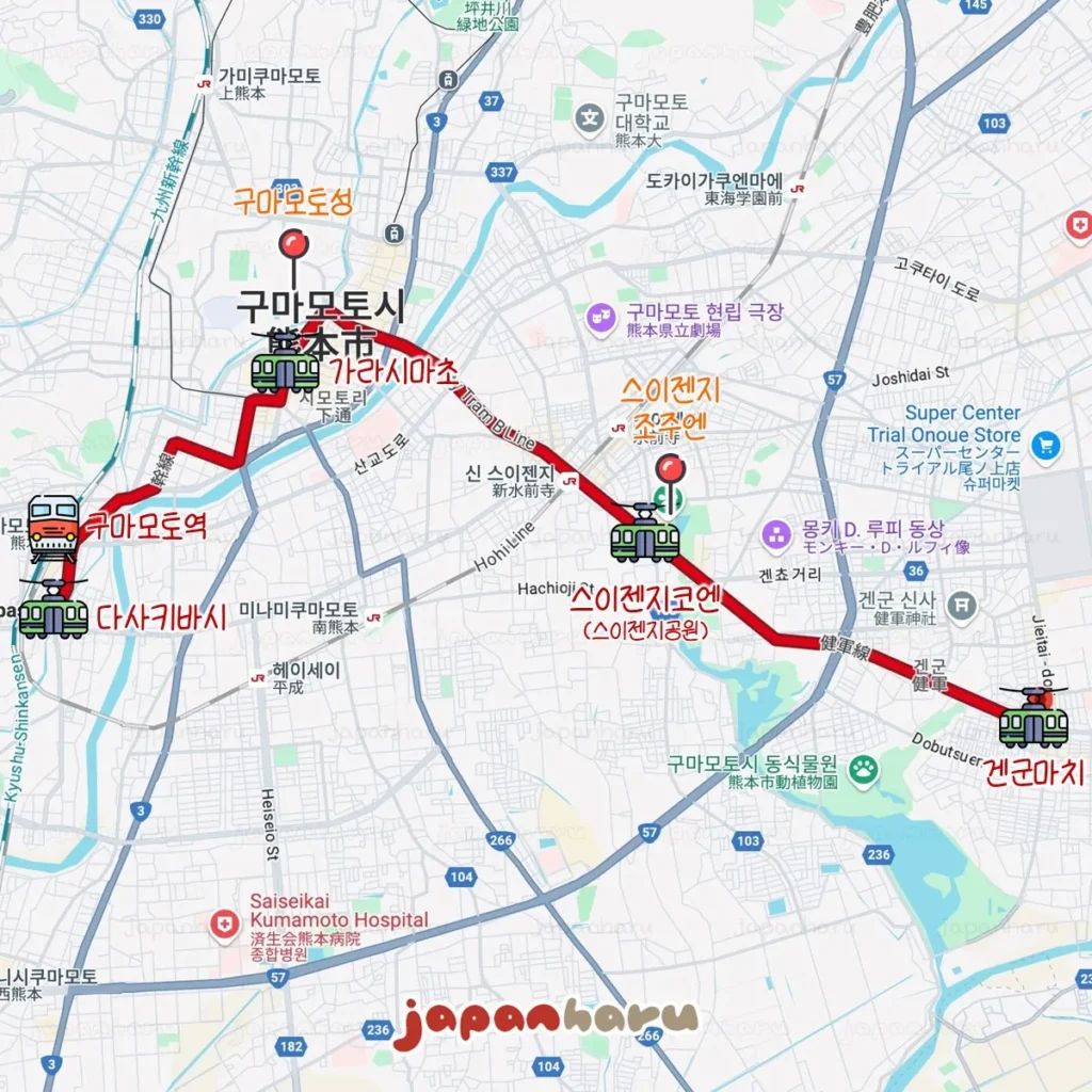 가라시마초 정류장부터 스이젠지 조주엔, 구마모토시 동식물원, 그리고 종점인 겐군마치까지는 두 노선 모두 동일한 노선이에요.