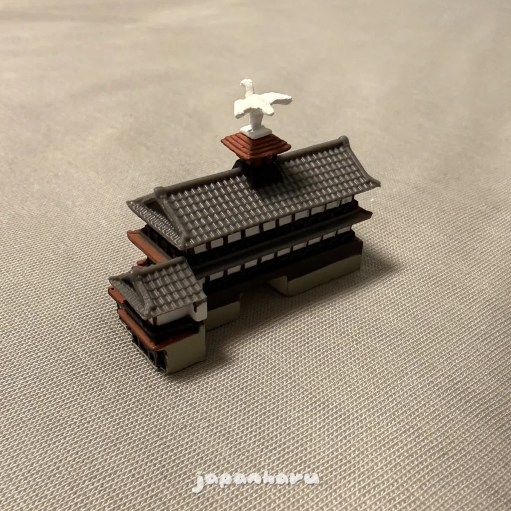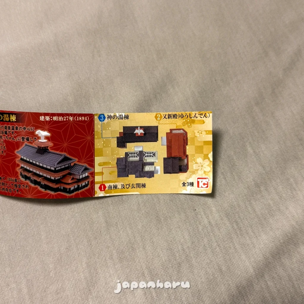 오른쪽 가챠는 도고온천 본관 모형 가챠인데, 3개 파츠로 나뉘어진 구조라 다 뽑기엔 어려울 것 같았어요 😅