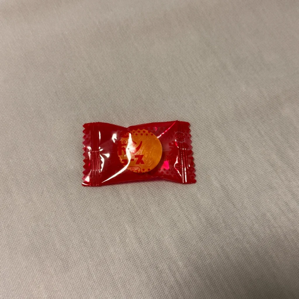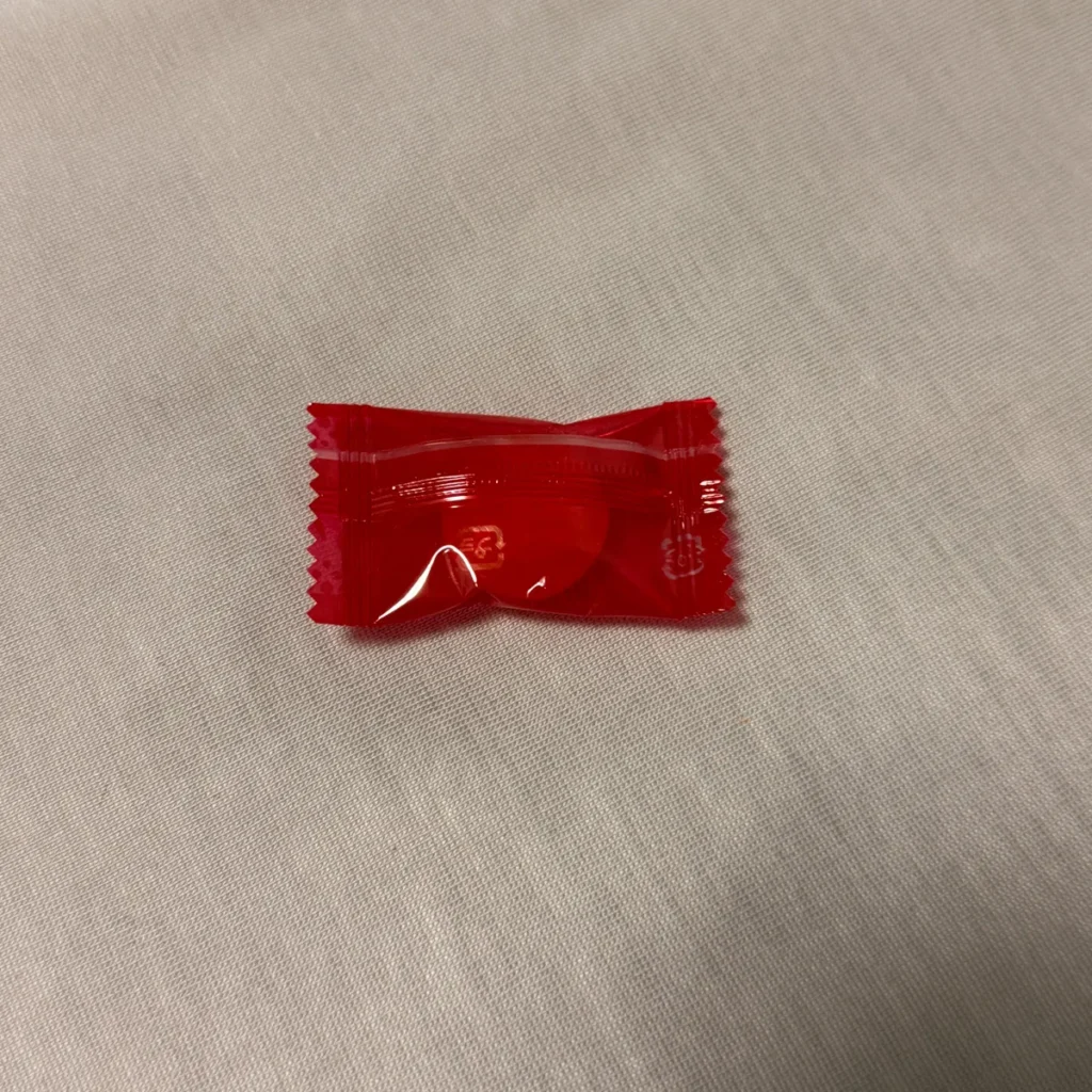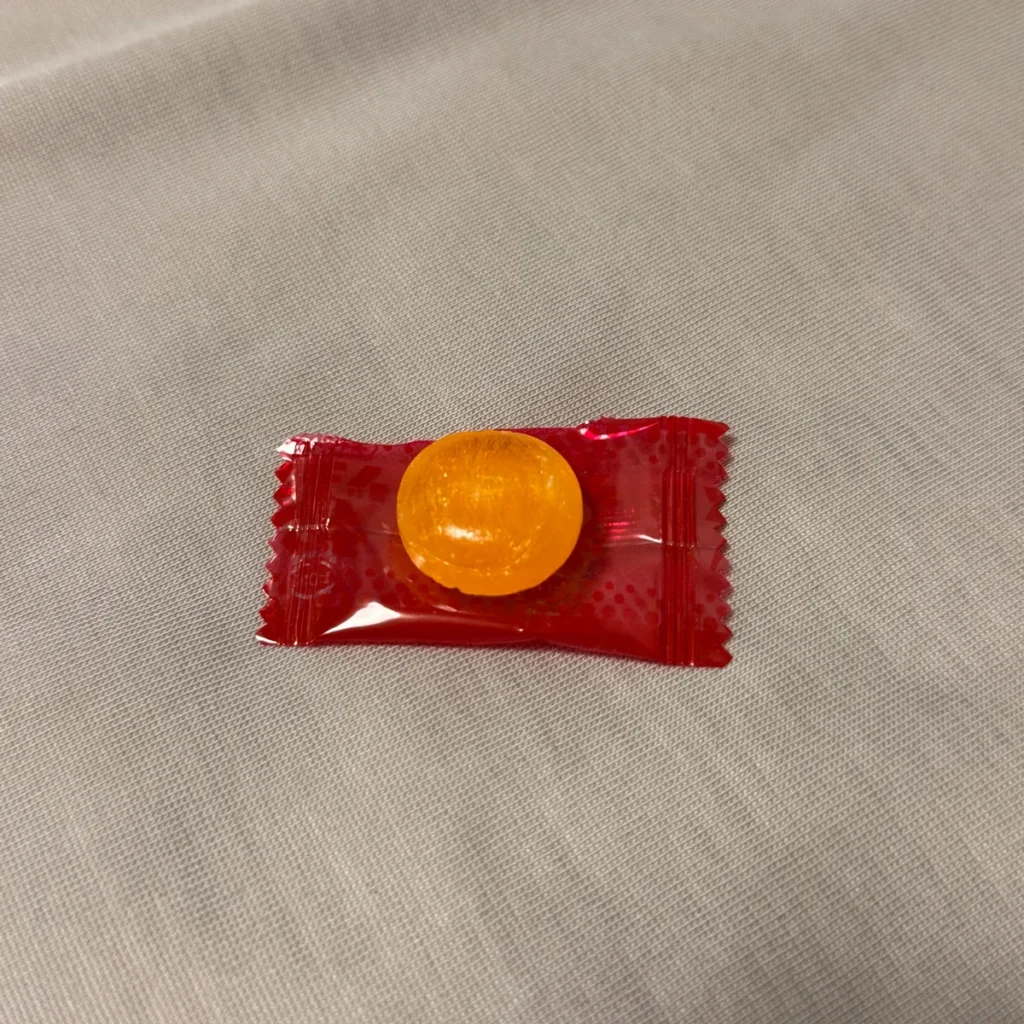 반투명한 붉은색 포장에 속에는 오렌지색 캔디가 들어있는 형태!
