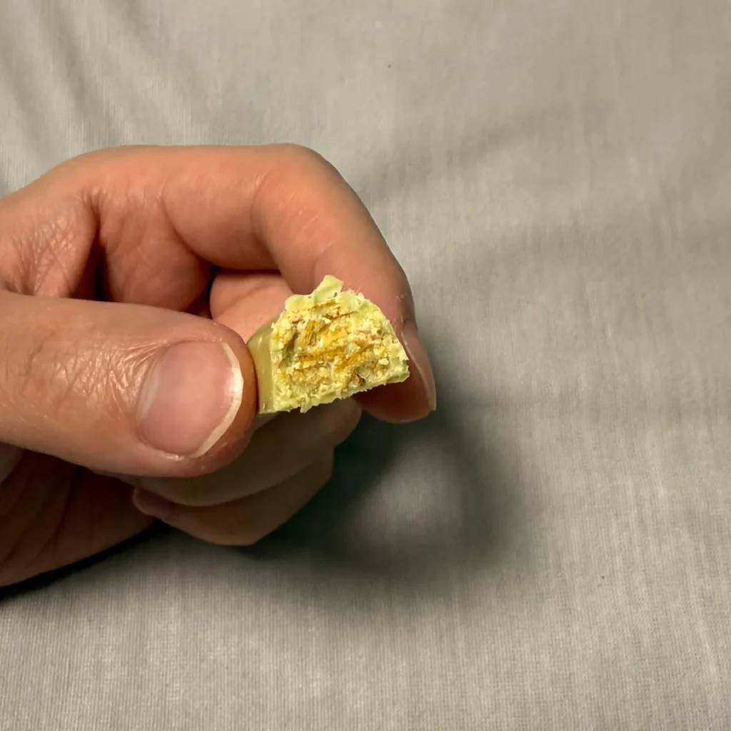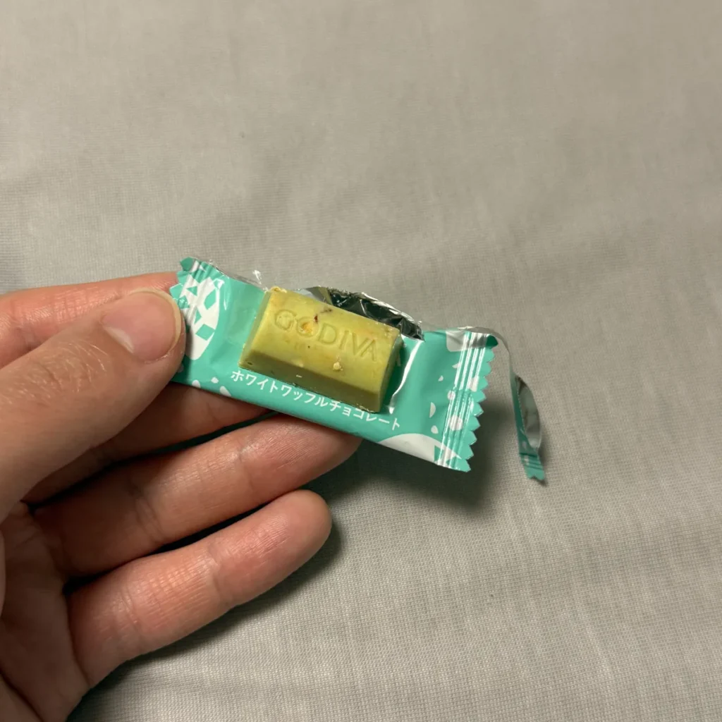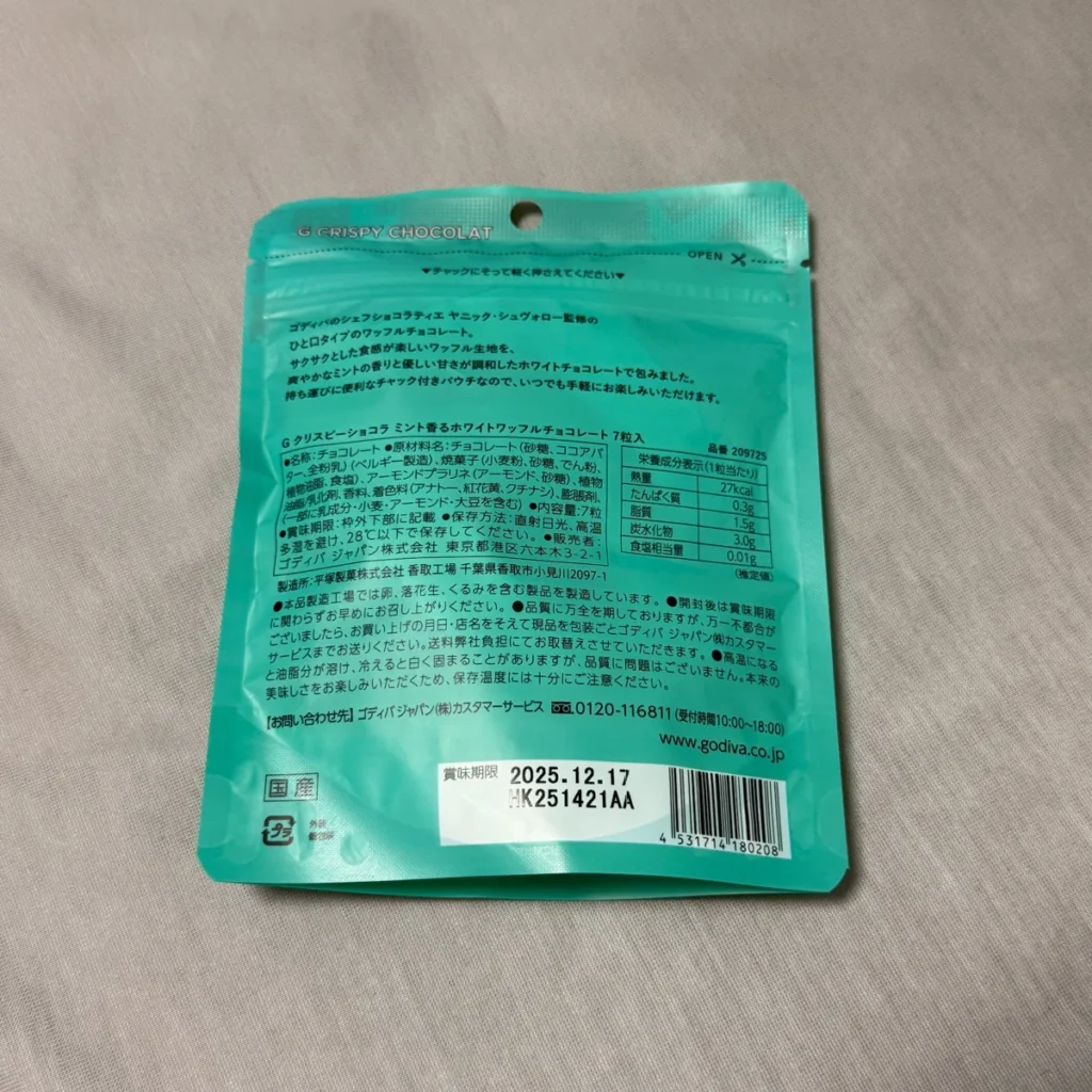 개인적으로 초콜릿은 달달한걸 좋아해서 민트초코를 좋아하진 않기 때문에 취향은 아니었는데 겉부분의 민트초코와 함께 초콜릿 안에 있는 크리스피한 느낌의 웨하스 과자 같은 식감이 느껴져서 전반적인 식감은 괜찮았어요.
