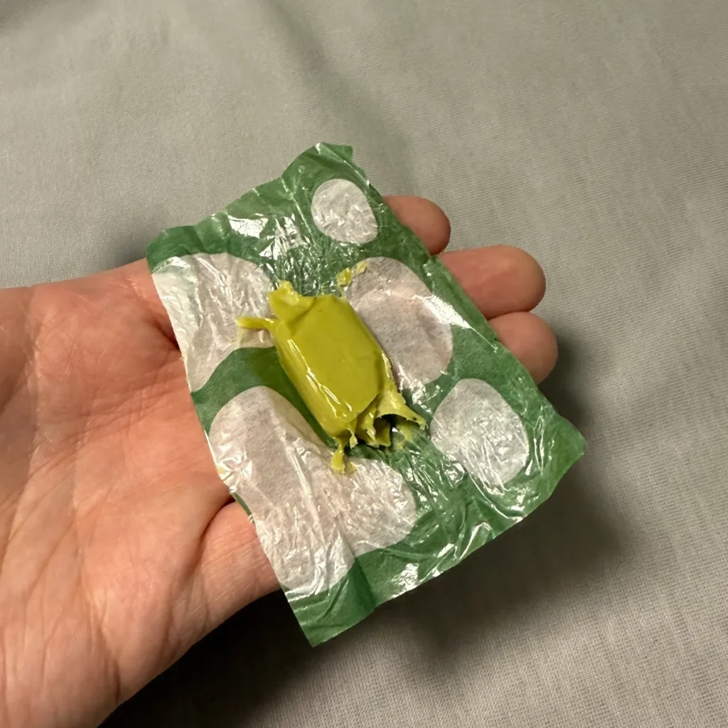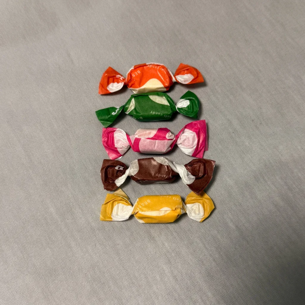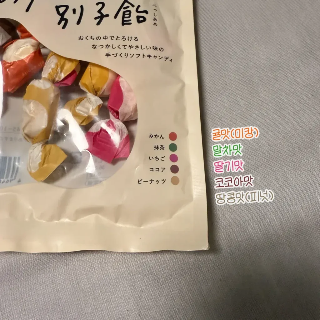 5가지 색깔로 된 캬라멜이었는데, 색깔별로 귤(미캉), 말차, 딸기, 코코아, 땅콩맛이 각각 2개씩 들어있었어요.