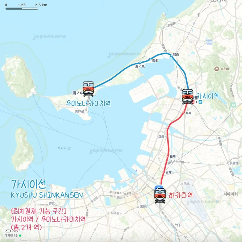 하카타역에서 가시이역을 지나 우미노나카미치역으로 가는 경우엔 터치결제를 이용할 수 있지만, 가시이역과 우미노나카미치역 사이에 있는 역들(간노스역, 나타역, 와지로역)에서는 터치결제를 이용할 수 없어요.
