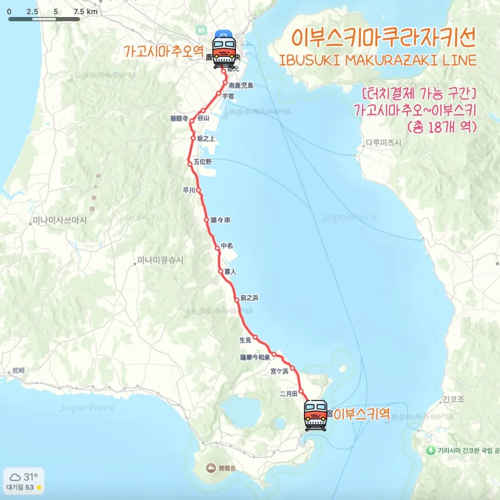 🟡 이부스키마쿠라자키선: 가고시마추오역~이부스키역 [총 18개 역]