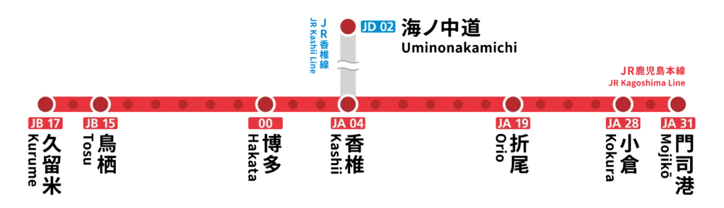 - 가고시마 본선: 구루메역~하카타역~고쿠라역~모지코역 [총 49개 역]