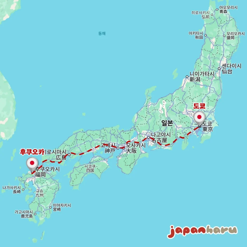 후쿠오카에서 도쿄까지 구글지도에서 자동차로 경로를 검색해보면 약 1,100km 정도로 나와요.