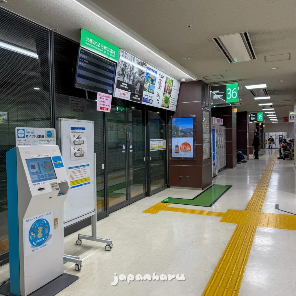하카타 버스 터미널의 3층 36번 승강장에서 탑승했어요!