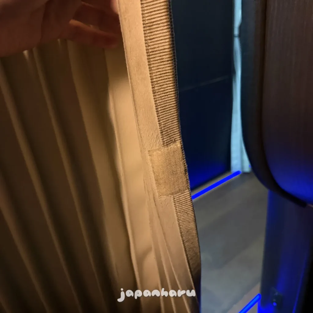 커튼은 이렇게 앞쪽의 찍찍이에 붙이면 완전히 닫을 수 있어요.