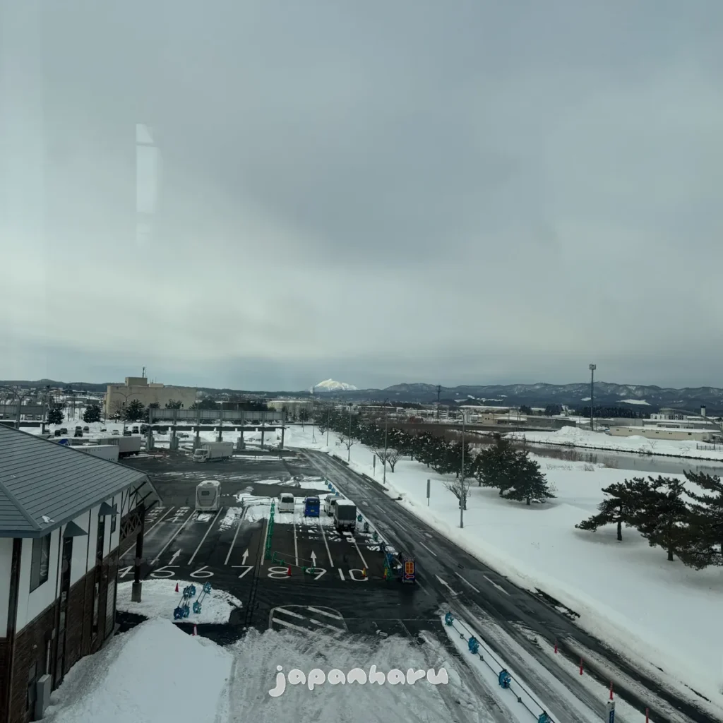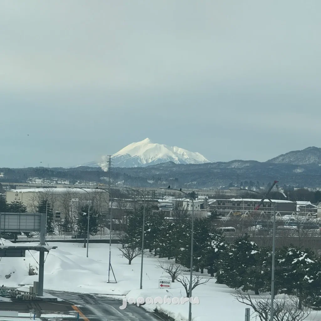 아까 도쿄에서 아오모리로 야간버스를 타고 오면서도 보였던 산인데, 방향을 보니 히로사키에 있는 ‘아와키산(岩木山)’ 같아요.