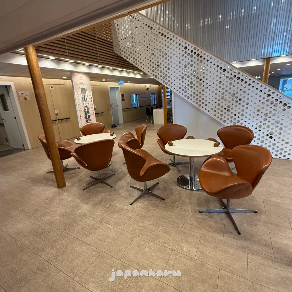 중앙 계단 옆에 이렇게 테이블과 의자가 놓인 공간이 있는데 오토샵이라고 해서 자판기 매점 느낌이에요.