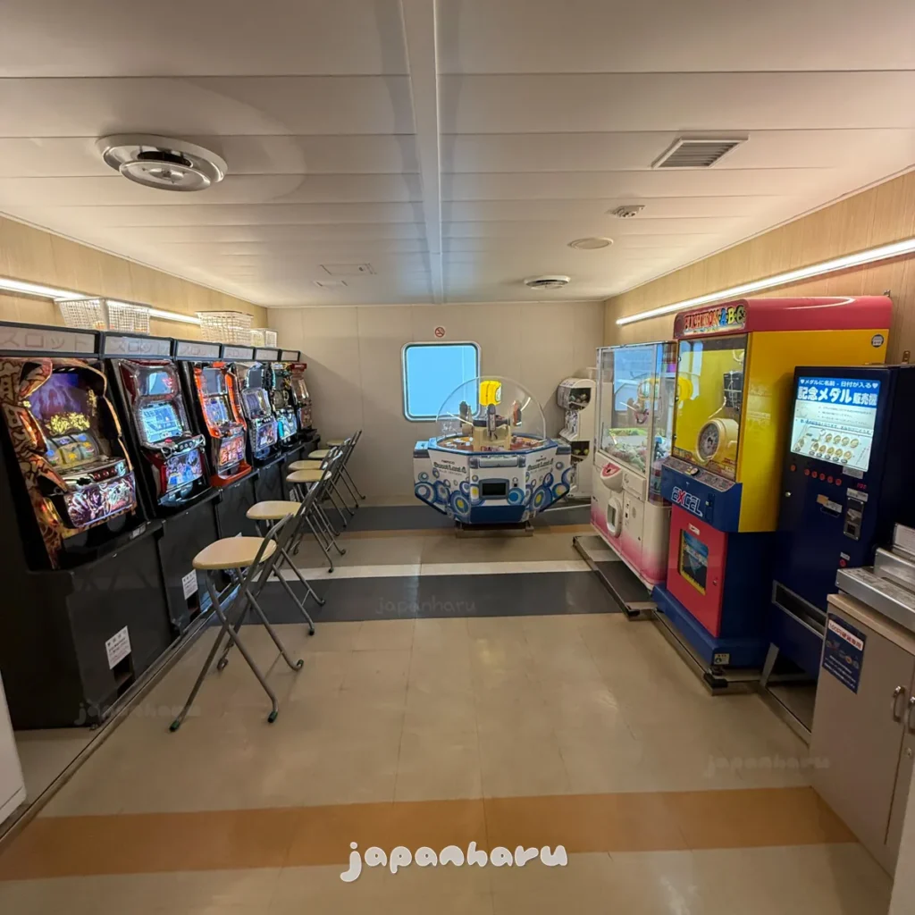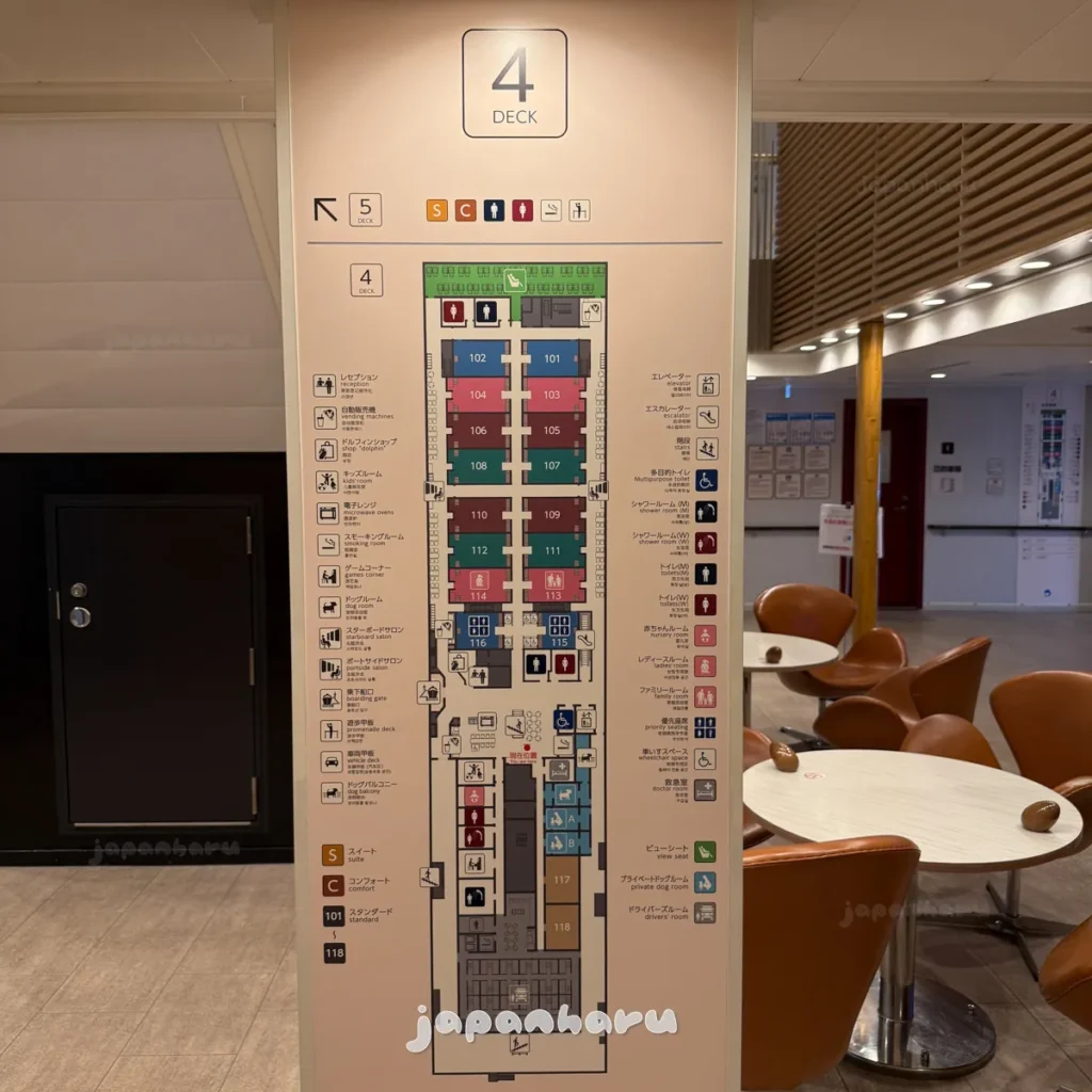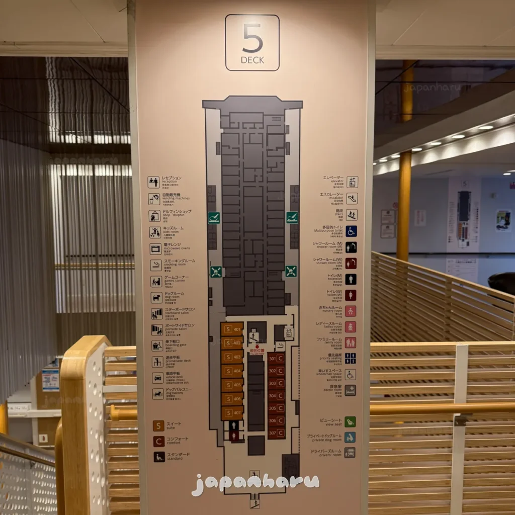 🔍 페리설비: 오토샵(자판기 코너) / 돌핀샵(기념품점) / 키즈룸 / 게임코너 / 샤워룸 / 엘리베이터 / 화장실