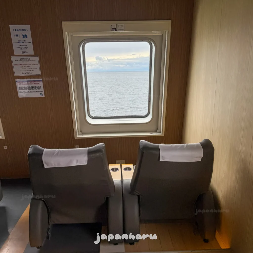좌석 2개씩 붙어있는 구조인데, 전면 창으로 바다가 보이는 오션뷰 좌석이에요 ☺️