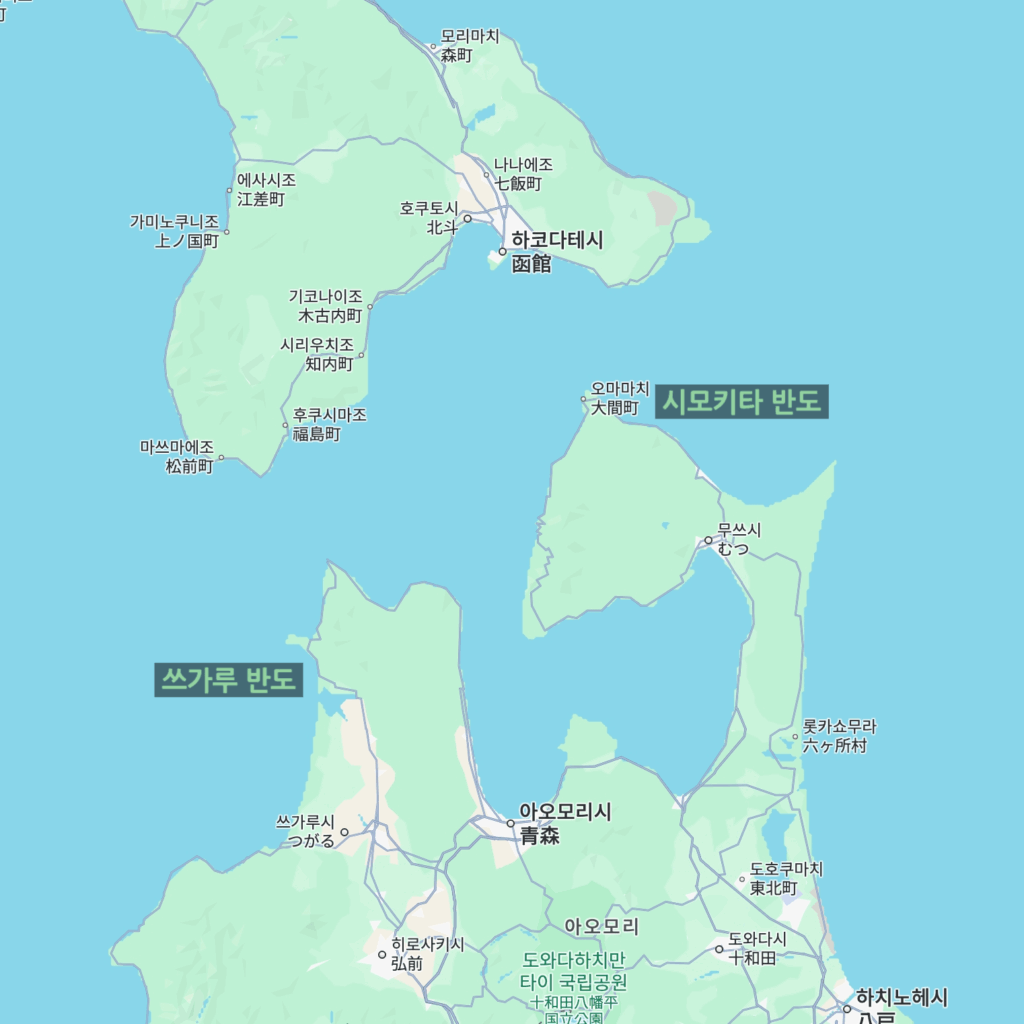 왼쪽에 있는 ‘쓰가루 반도(津軽半島)’, 오른쪽에 있는 ‘시모키타 반도(下北半島)’에요.