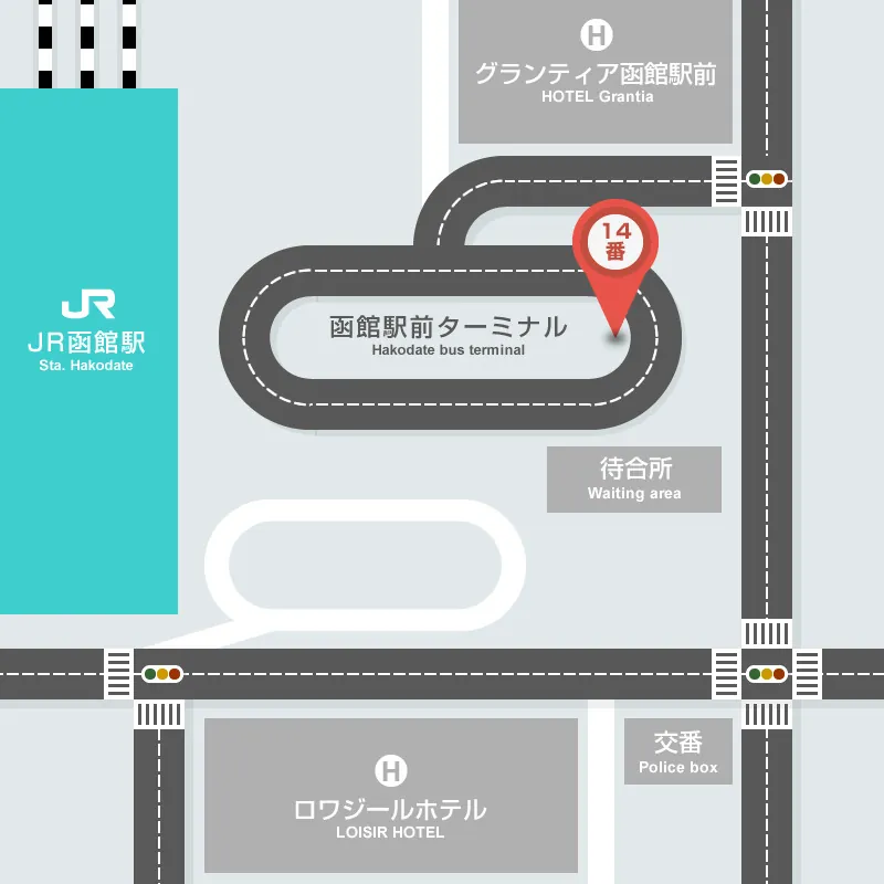 하코다테역 앞에는 버스정류장이 여러 곳 있는데, 그 중에 14번 승강장에서 탈 수 있다고 적혀있었어요.