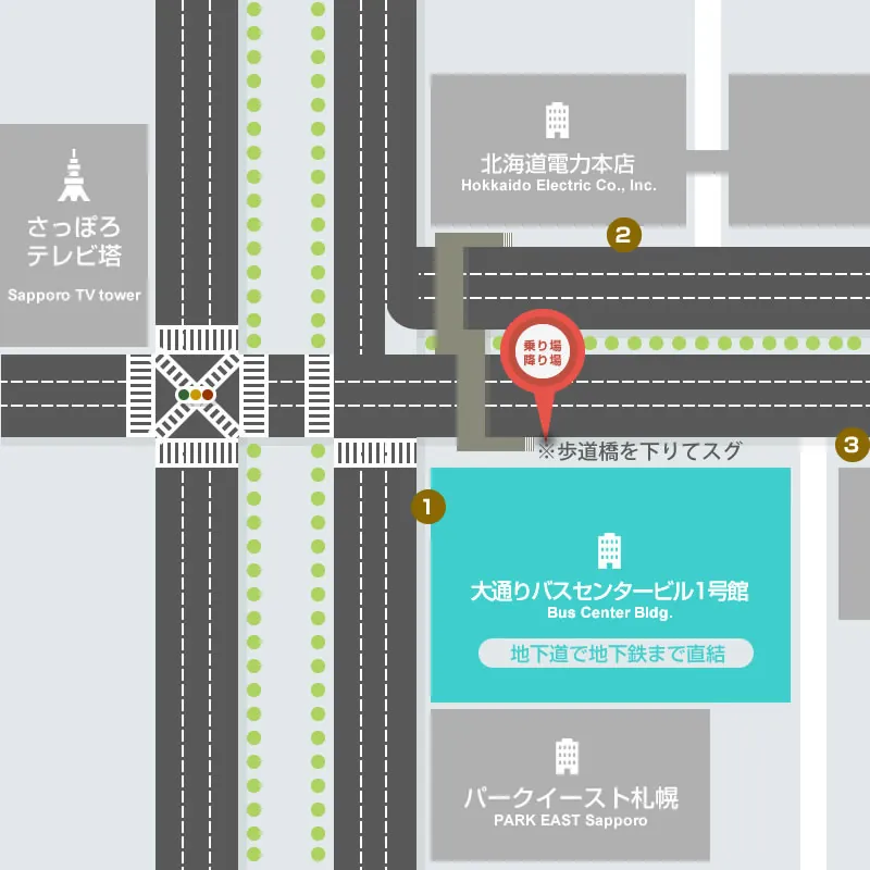 삿포로 시내에서는 여러 하차장소가 있지만 대표적으로는 ‘삿포로역 앞’과 ‘오도리 버스 센터 앞’이 있어요.
