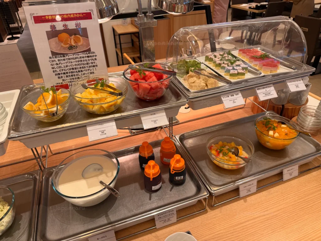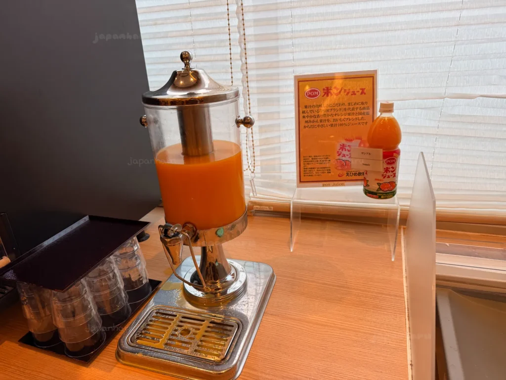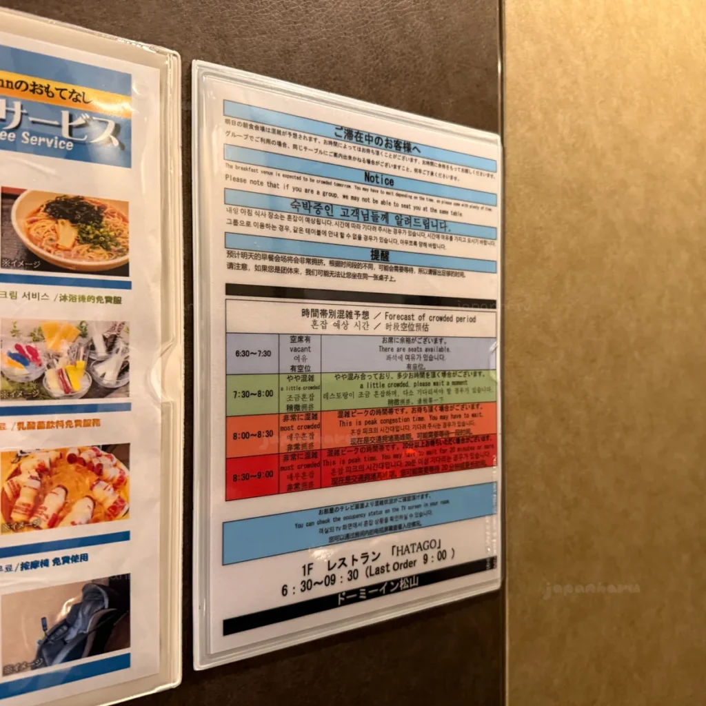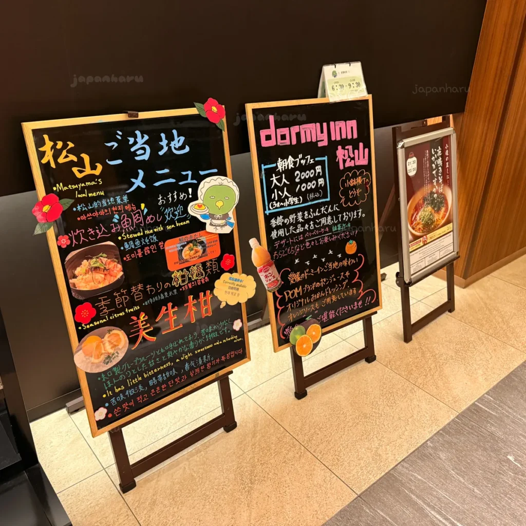 조식에는 마쓰야마의 현지 메뉴와 감귤주스로 유명한 퐁주스 등이 나온다고 1층 엘리베이터 앞에 적혀있어요.