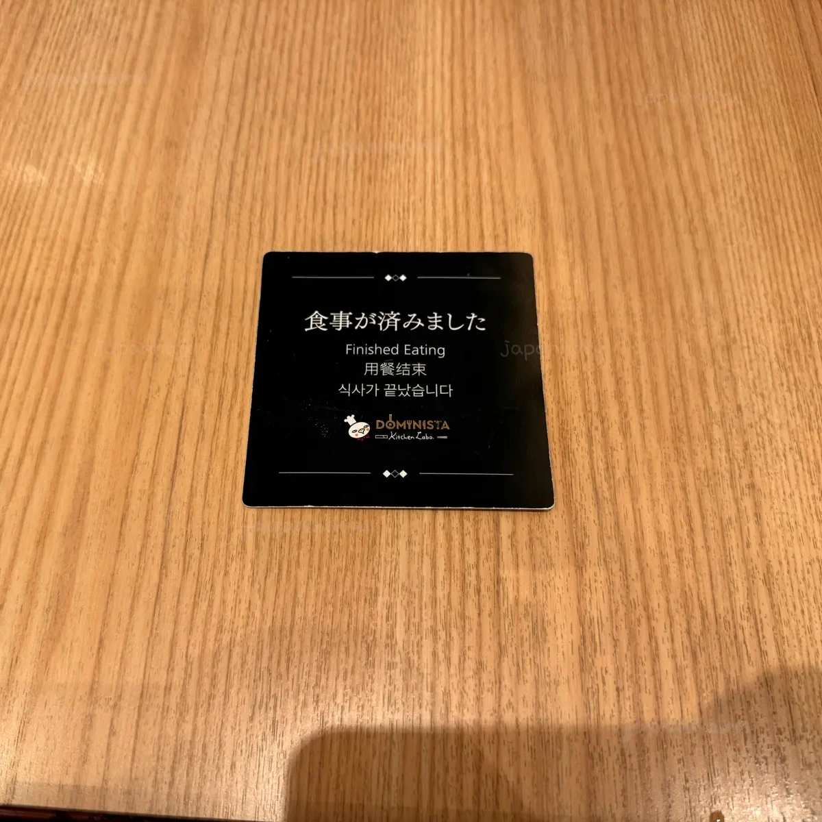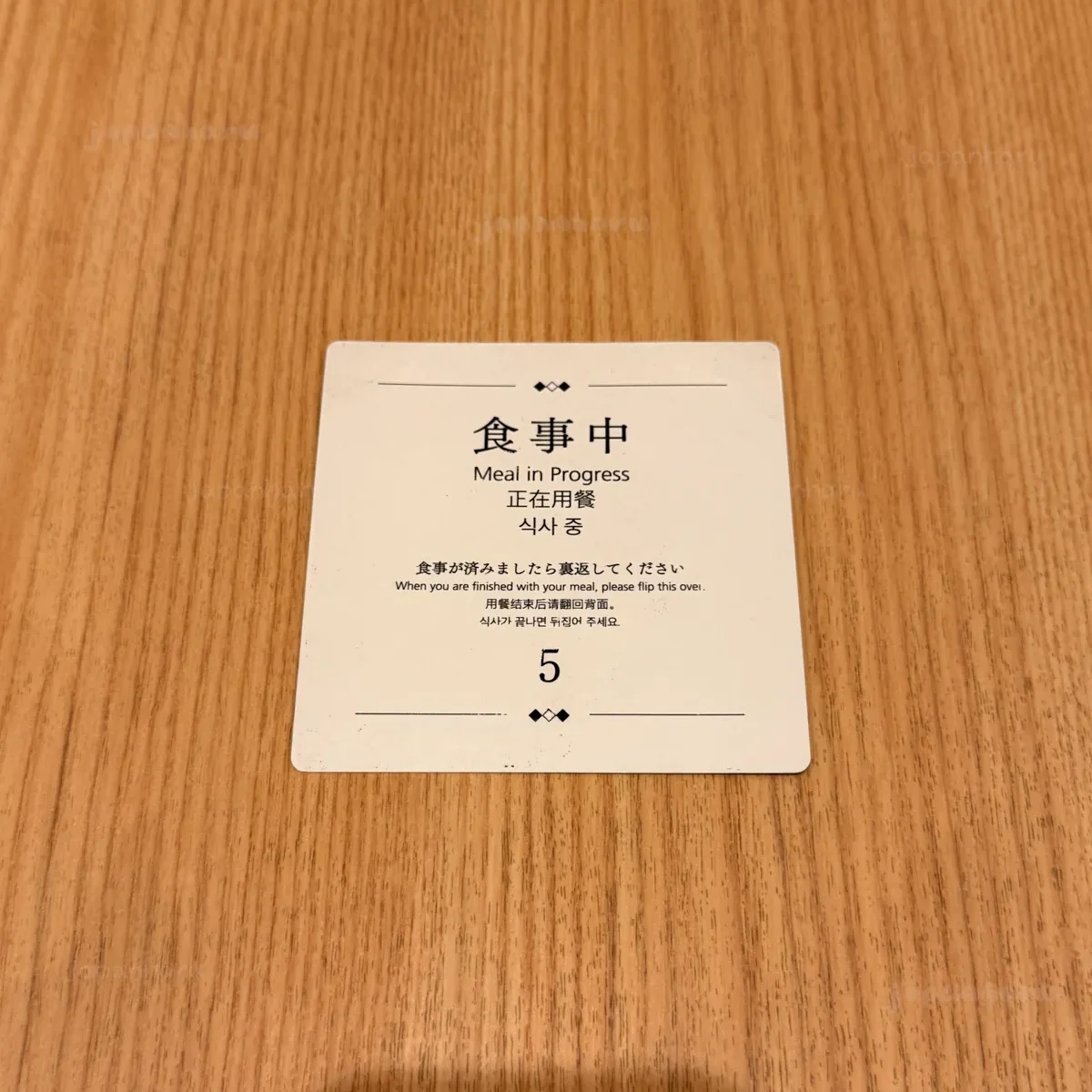 원하는 테이블에 하얀색의 ‘식사 중’ 카드를 올려두고 식사를 가져오고 음료를 가져오면서 먹고 다 먹으면 ‘식사가 끝났습니다’라고 적힌 검은색 부분으로 뒤집어 놓으면 돼요.