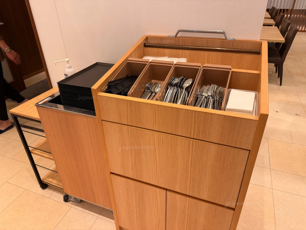 이렇게 입구 근처에 쟁반과 젓가락, 숟가락, 포크, 냅킨이 있어요.
