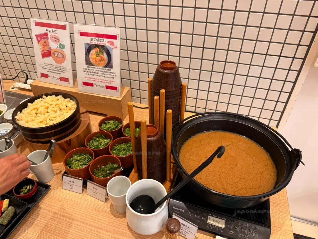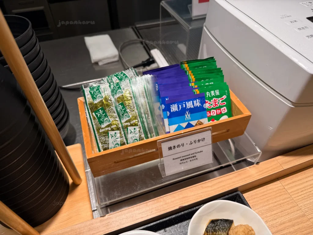 그 옆에 다시차즈케(오차즈케와 비슷하지만 오차즈케는 밥에 차를 부어 먹는 음식, 다시차즈케는 다시육수를 밥에 부어 먹는 음식이라고 할 수 있어요)를 위한 다시육수와 김가루 등도 있어요.