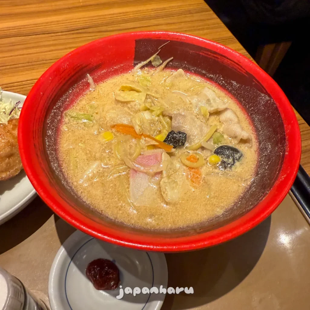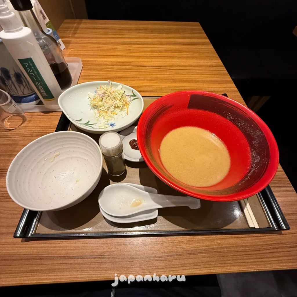 감칠맛 짬뽕과 가라아게 정식(コク旨ちゃんぽんとから揚げの定食)이라는 메뉴인데, 진한 흰 국물에 더해 가라아게도 2개 같이 있는 메뉴라서 괜찮을 것 같아서 주문해봤어요.