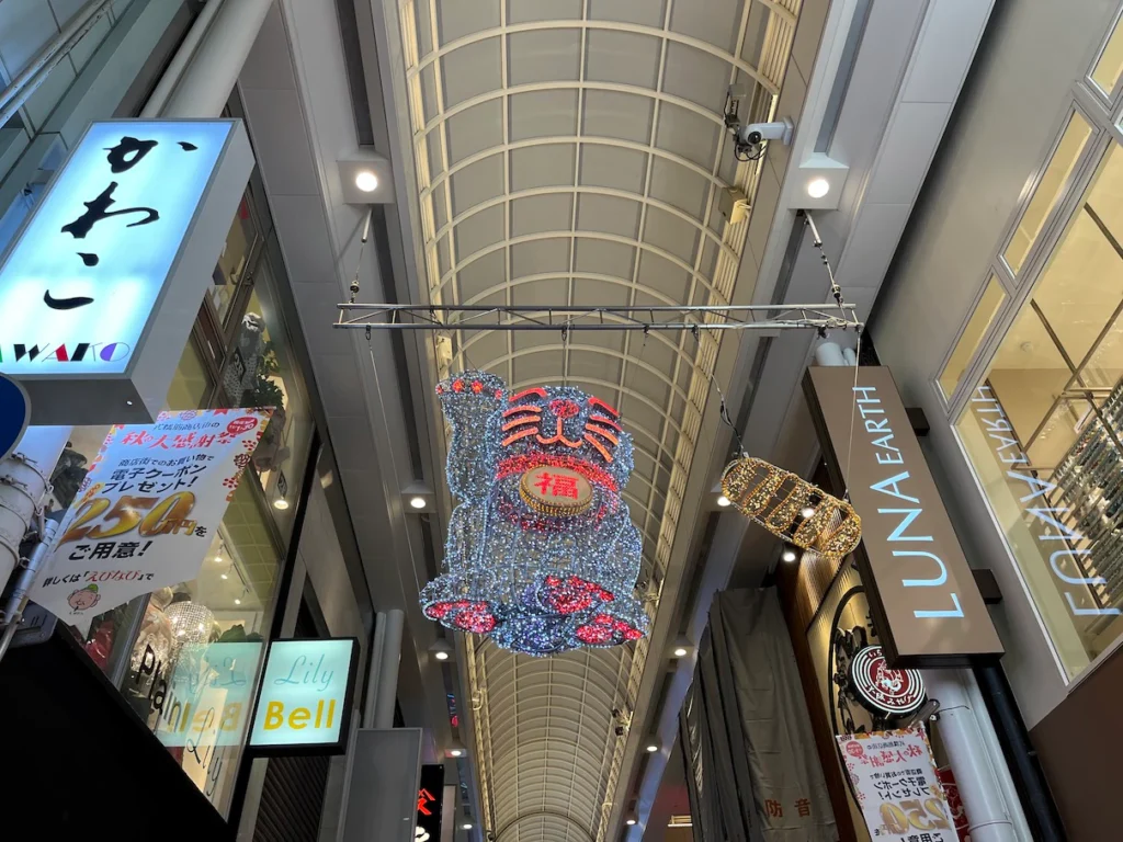 일본의 복고양이 모양 조명장식이 상점가 천장에 붙어있네요.