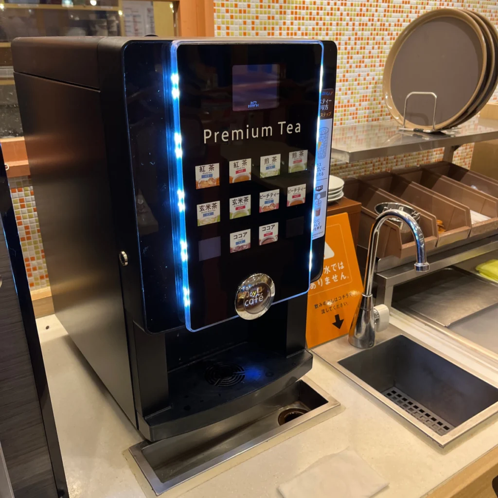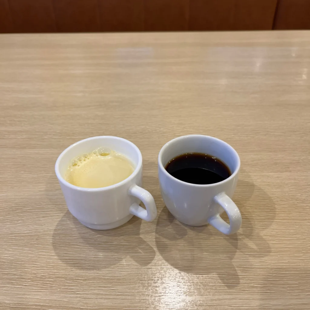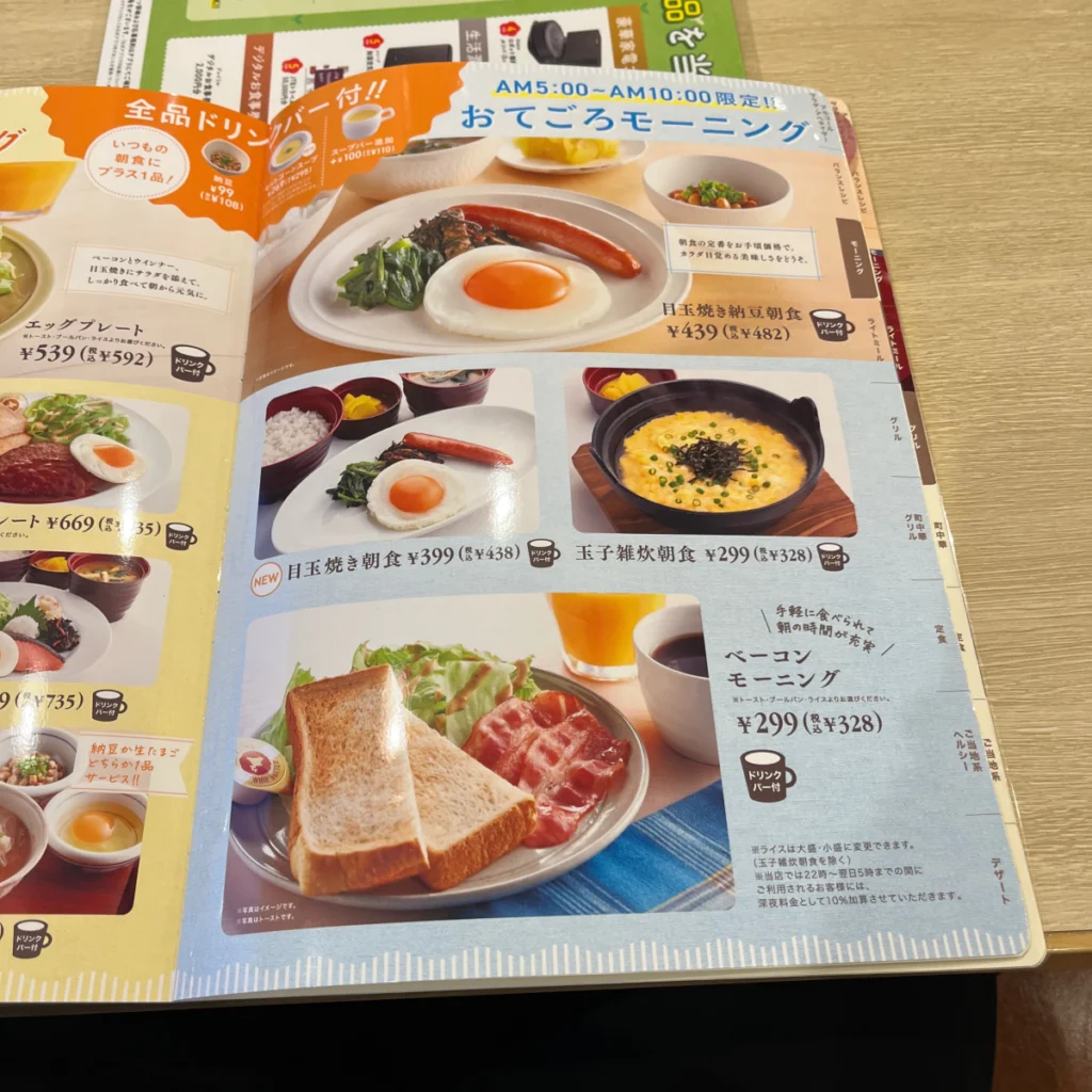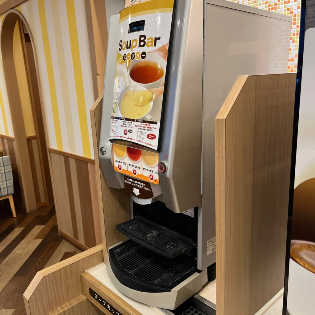 모닝 메뉴에는 드링크바는 포함된 금액이고, ‘수프바’라고 해서 콘수프와 같은 수프를 먹을 수 있는 무한리필 코스는 추가로 110엔을 내면 이용 가능해요!