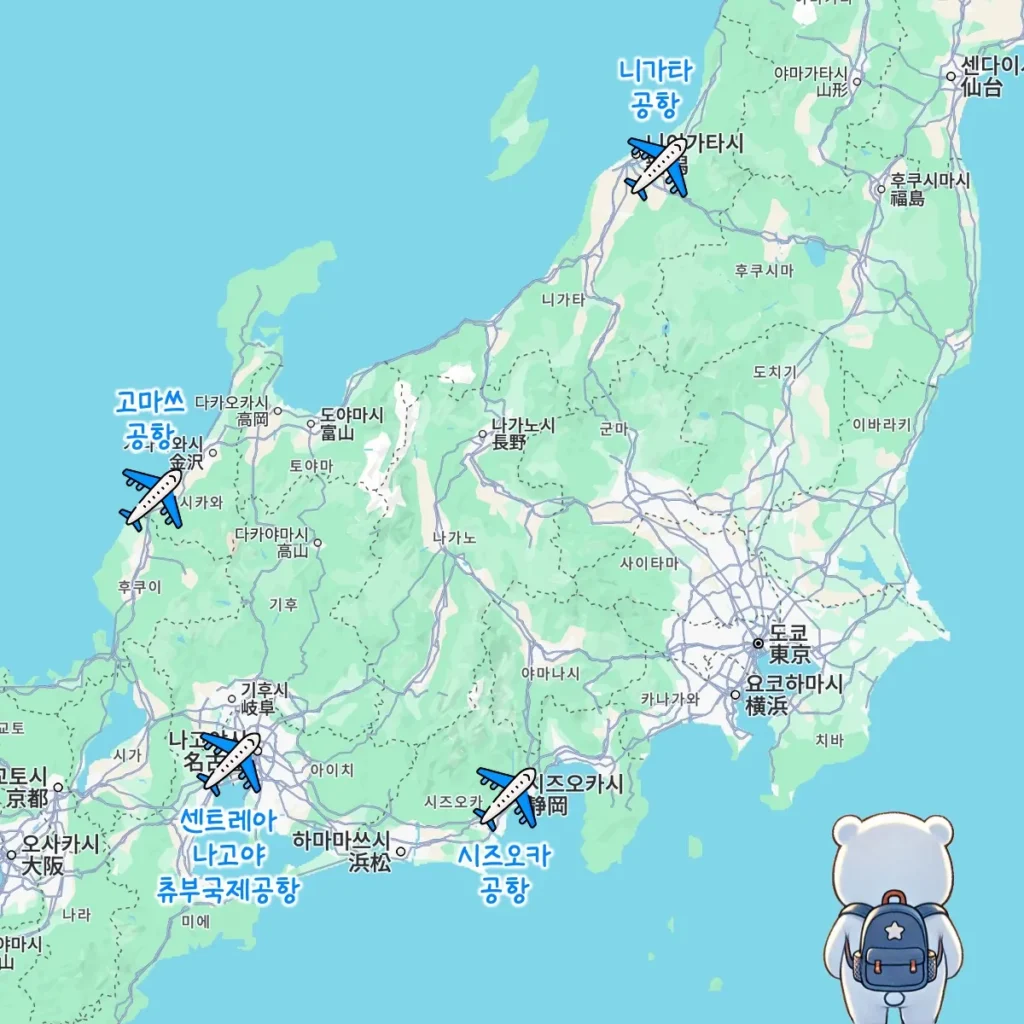츄부지방의 중심도시라 할 수 있는 나고야의 ‘센트레아 나고야 츄부국제공항’, 나고야와 도쿄 사이에 있는 시즈오카의 ‘시즈오카 공항’, 그리고 호쿠리쿠 지방이라 불리는 북쪽에서는 니가타 공항과 고마쓰 공항이 있어요.