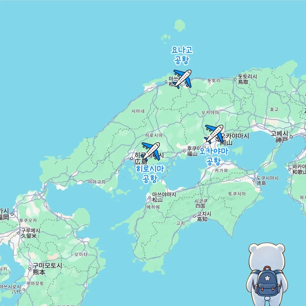 돗토리 사구로 유명한 돗토리 옆의 요나고에 있는 ‘요나고 공항’, 히로시마의 ‘히로시마 공항’, 오카야마의 ‘오카야마 공항’이에요.