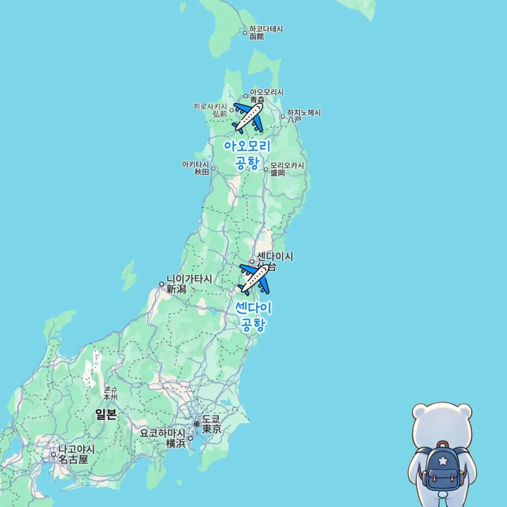 도호쿠의 유일한 대한민국 총영사관이 있는 센다이, 그리고 도호쿠에서는 가장 북쪽에 있는 아오모리에 직항편이 있어요.
