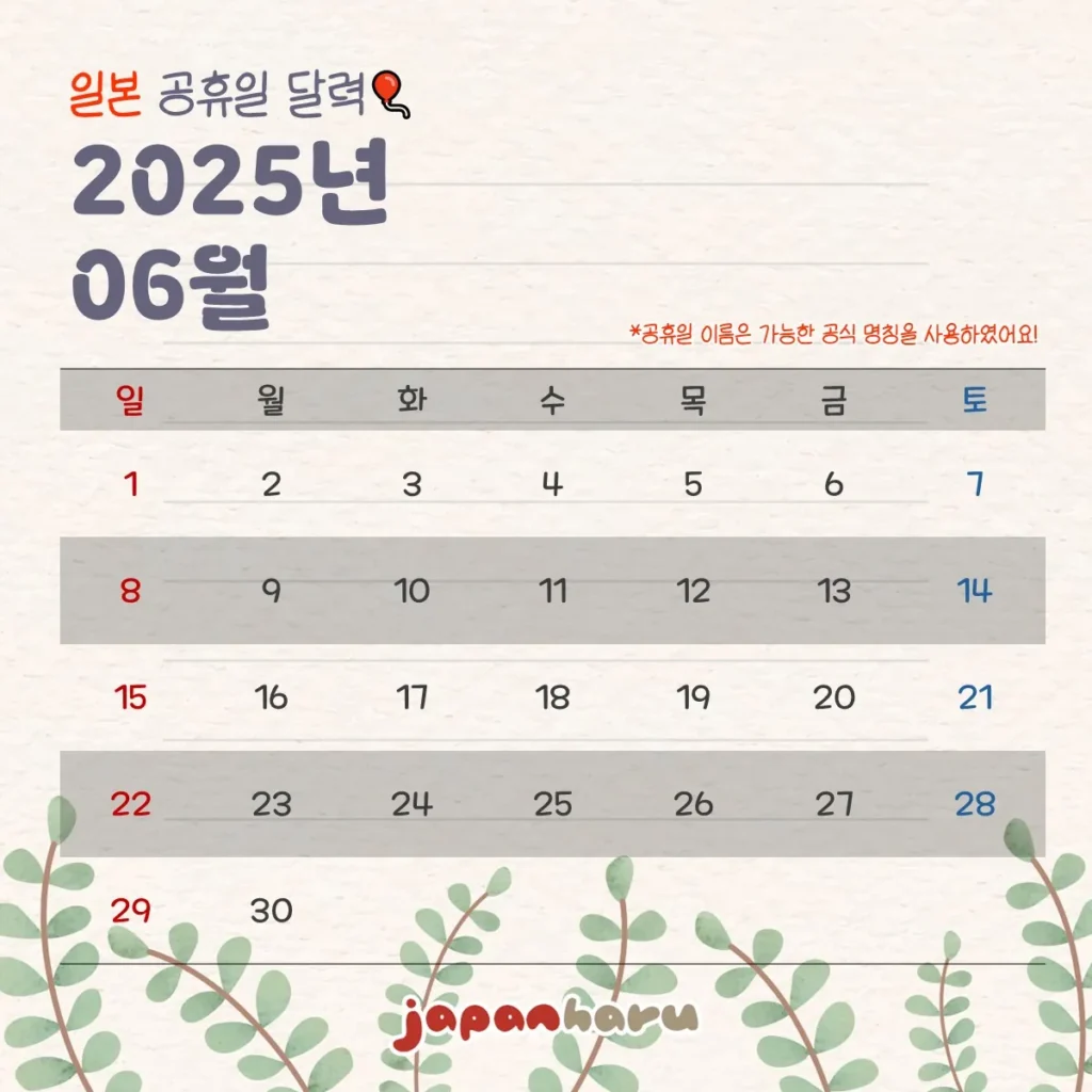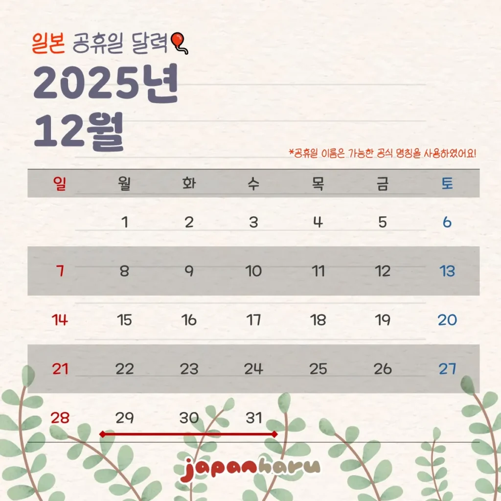 ❗️ 공휴일에 더해서 달력에 표시되지 않은 ‘암묵적 휴일’도 있어요!(일반적으로 아래와 같이 쉬어요)