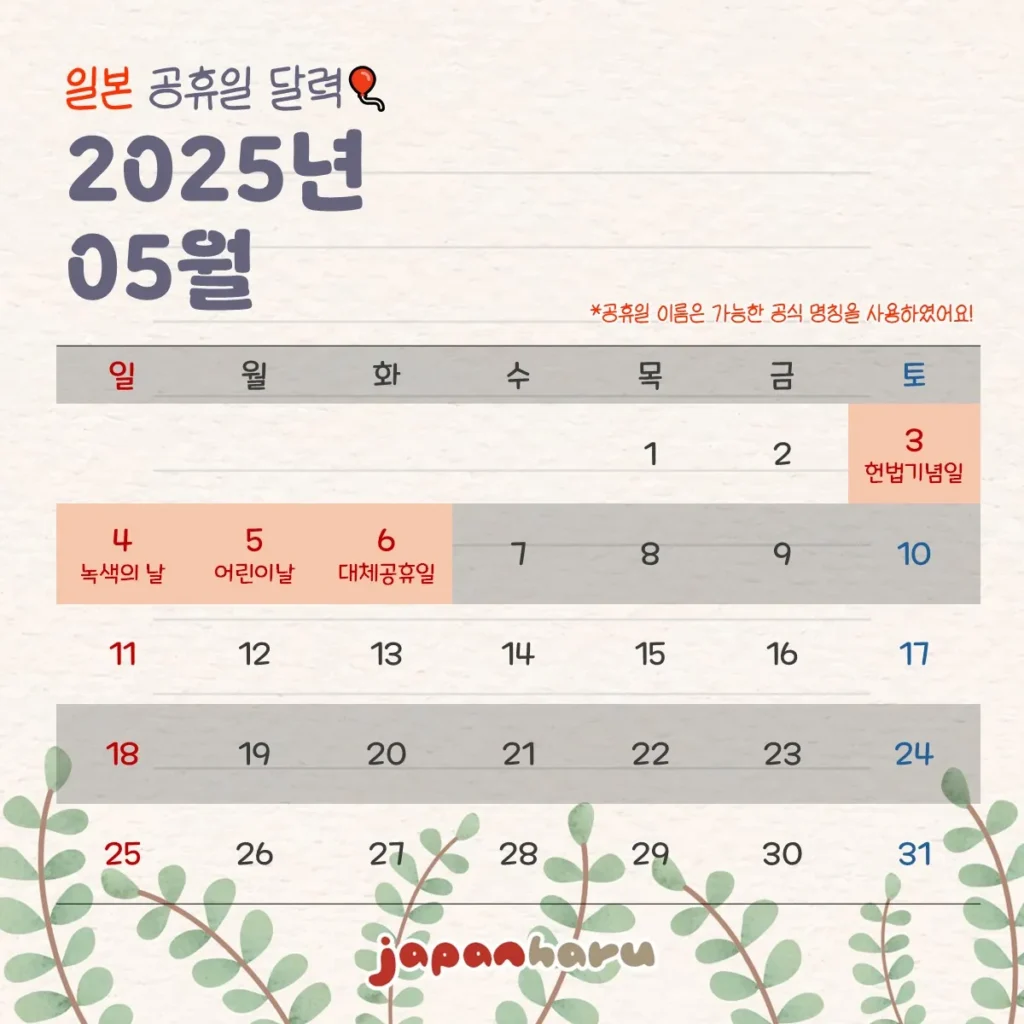 위의 공휴일을 보면 알겠지만, 5월에는 ‘골든위크(GW)’라고 해서 거의 일주일에 가깝게 쉬는 경우가 생겨요.