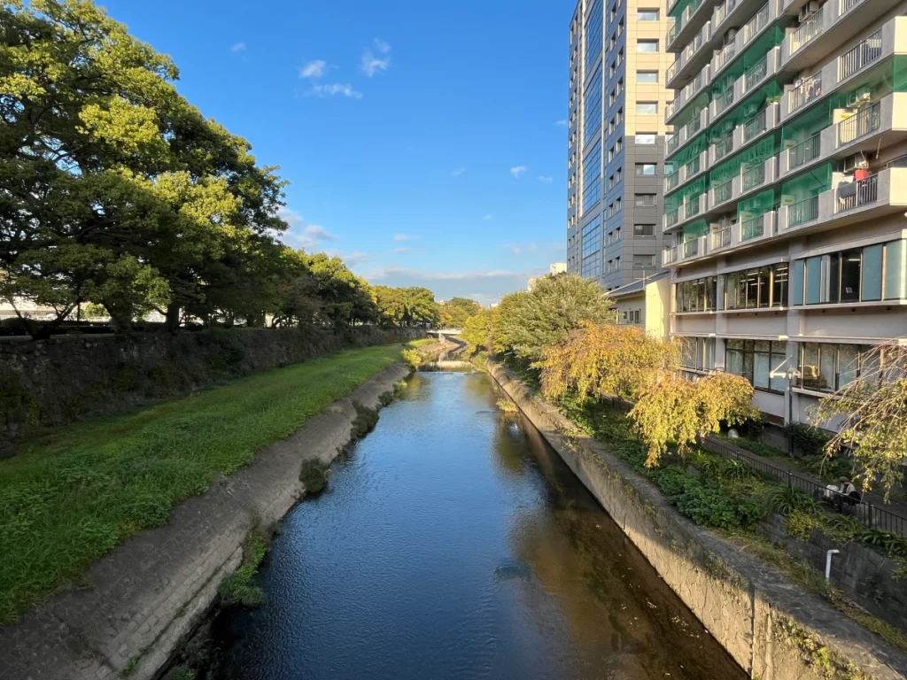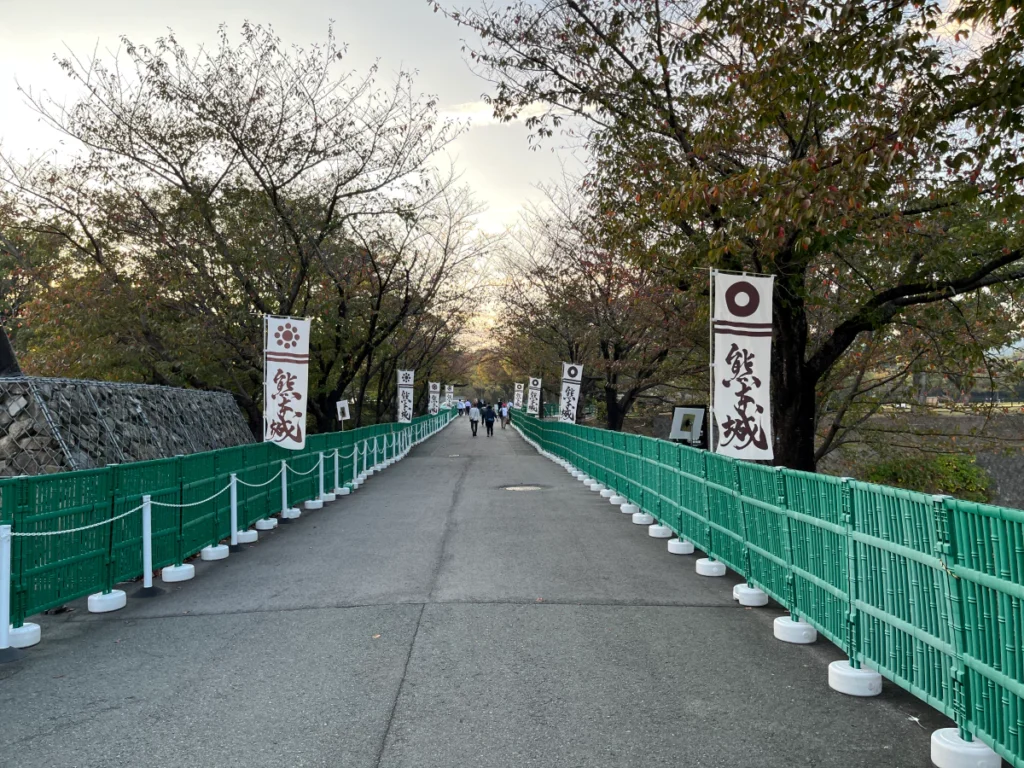 중간에 다리를 지나니 저 멀리 구마모토성이 보이네요.