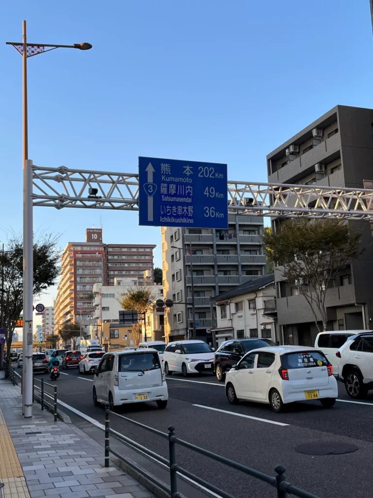 제가 오늘 가고시마에 오기 전에 있던 구마모토까지 202km라는 표지판이 보이네요.