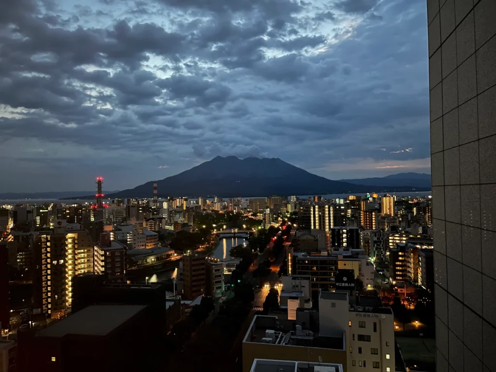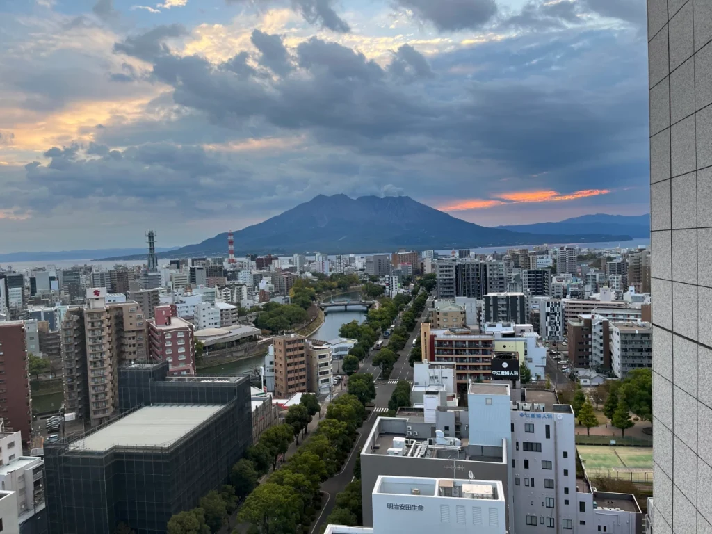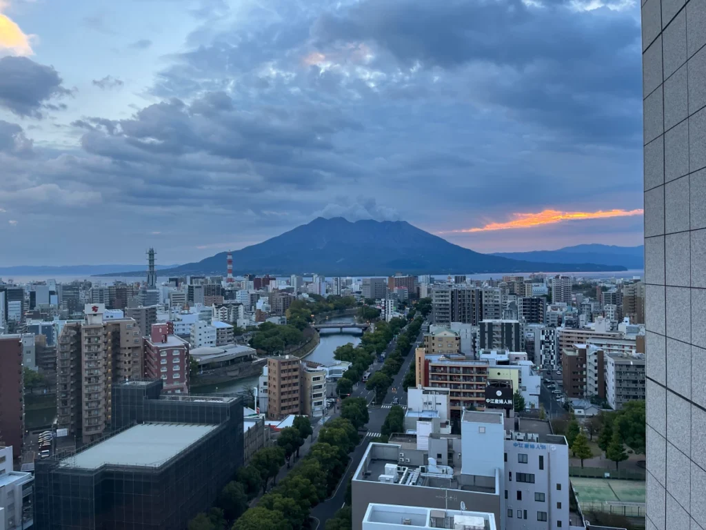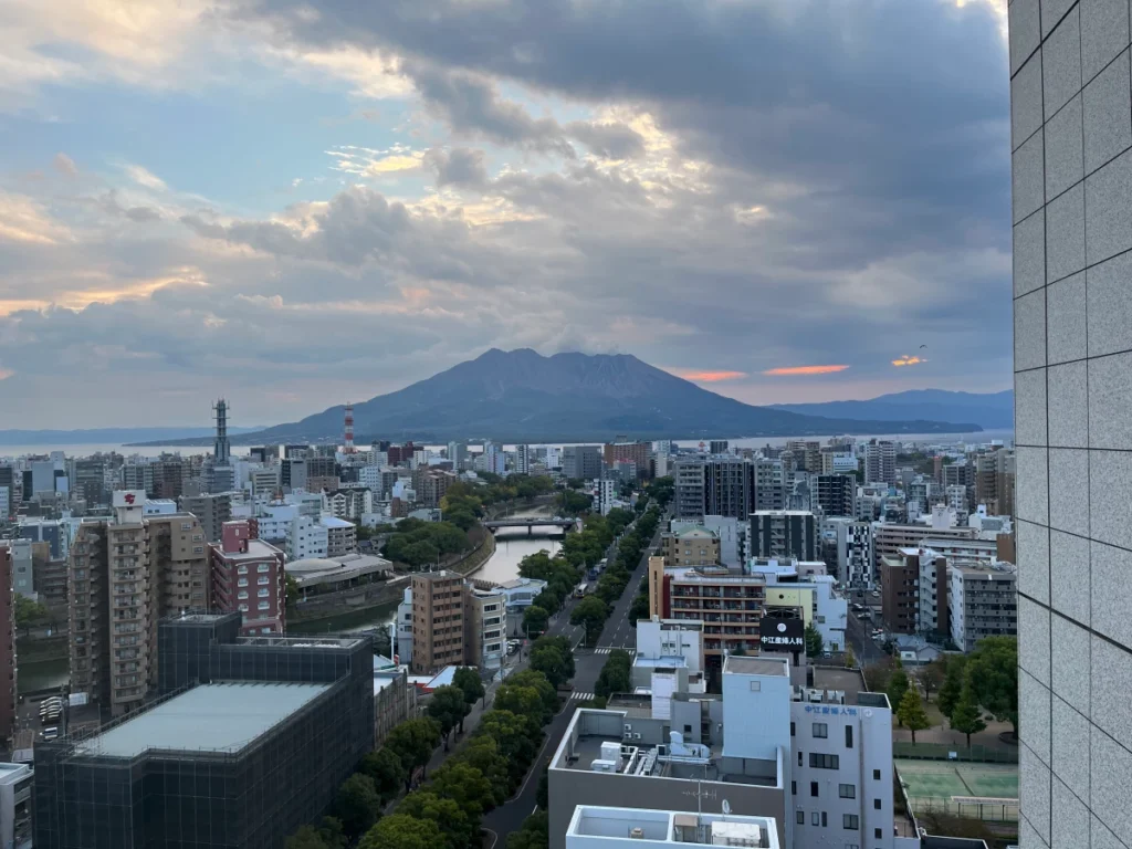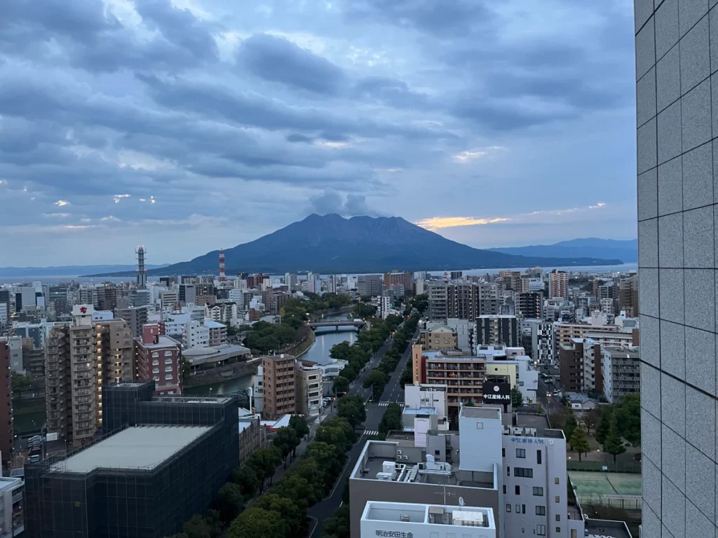 호텔 객실에서 사쿠라지마를 바라봐요.