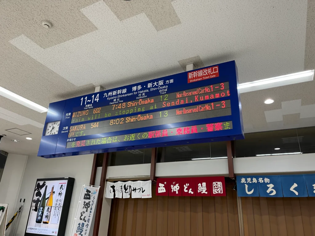 가고시마추오역에 도착하니 탈 예정인 신칸센 ‘미즈호 602호’ 열차에 대한 안내가 전광판에 보여요.