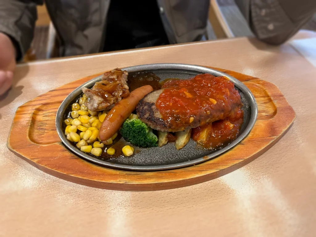 함박스테이크, 소세지, 스위트콘 등으로 이루어진 고기메뉴에요.