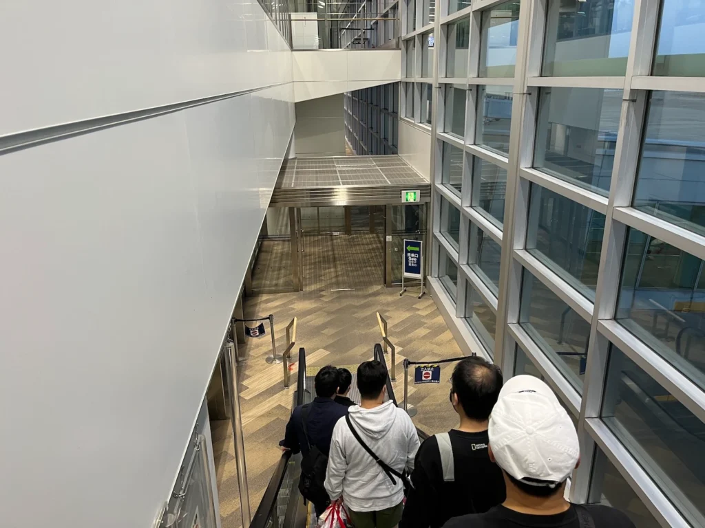 에스컬레이터로 한 층을 내려 비행기로 향해요.