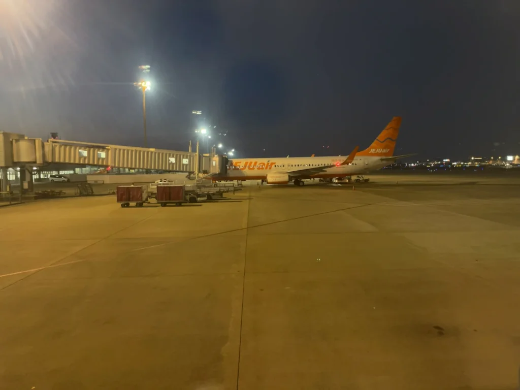 옆 게이트로 제주항공 비행기가 들어와요.