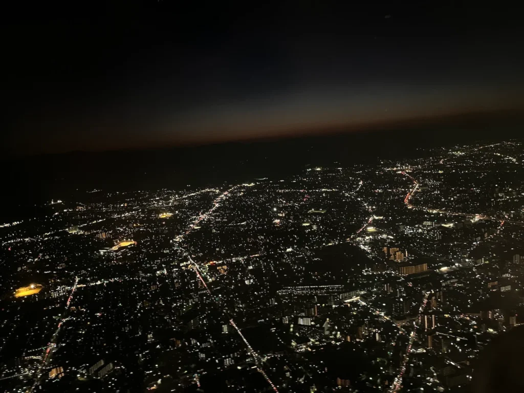 비행기가 이륙하고 후쿠오카 상공을 지나요.
