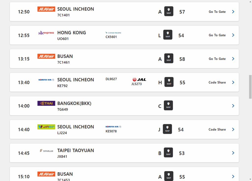 공항 홈페이지에서 오늘의 항공편 검색(오늘의 운항 정보 검색)에 들어가 국제선 메뉴를 보면 아래와 같이 체크인 카운터와 탑승 게이트 정보를 볼 수 있어요.