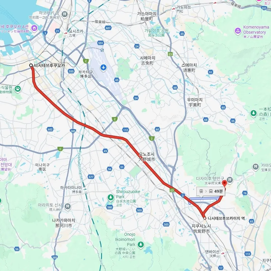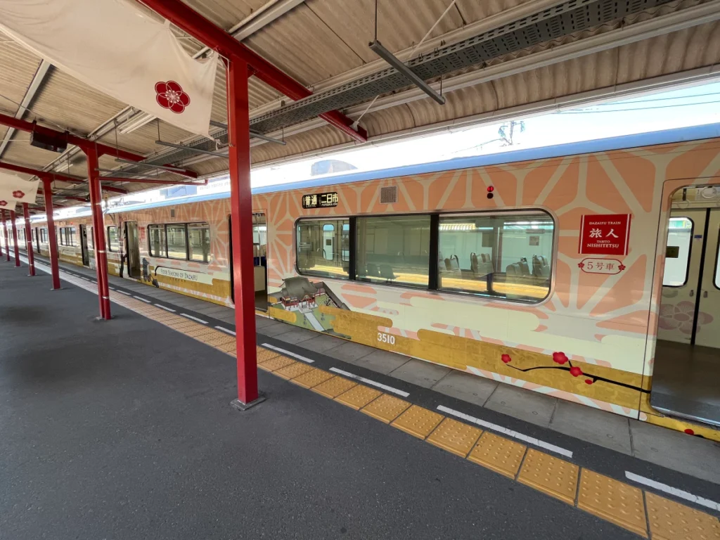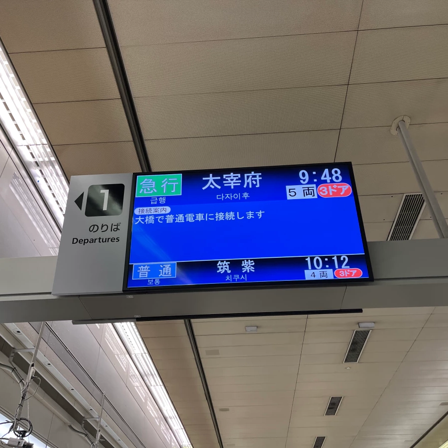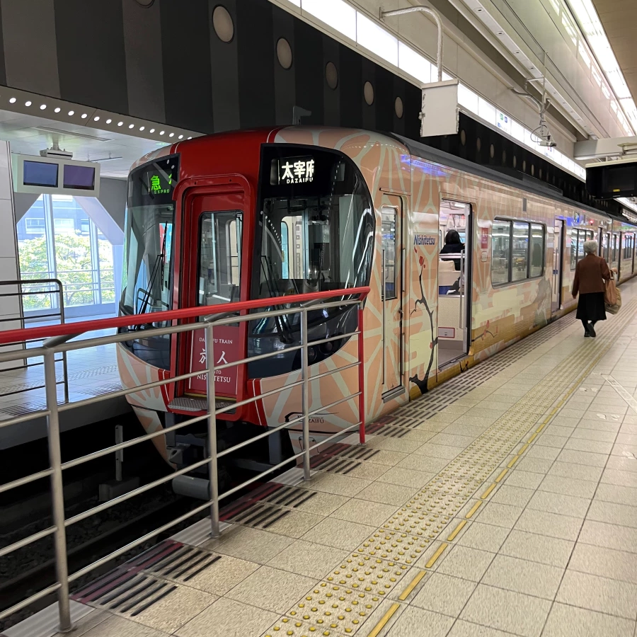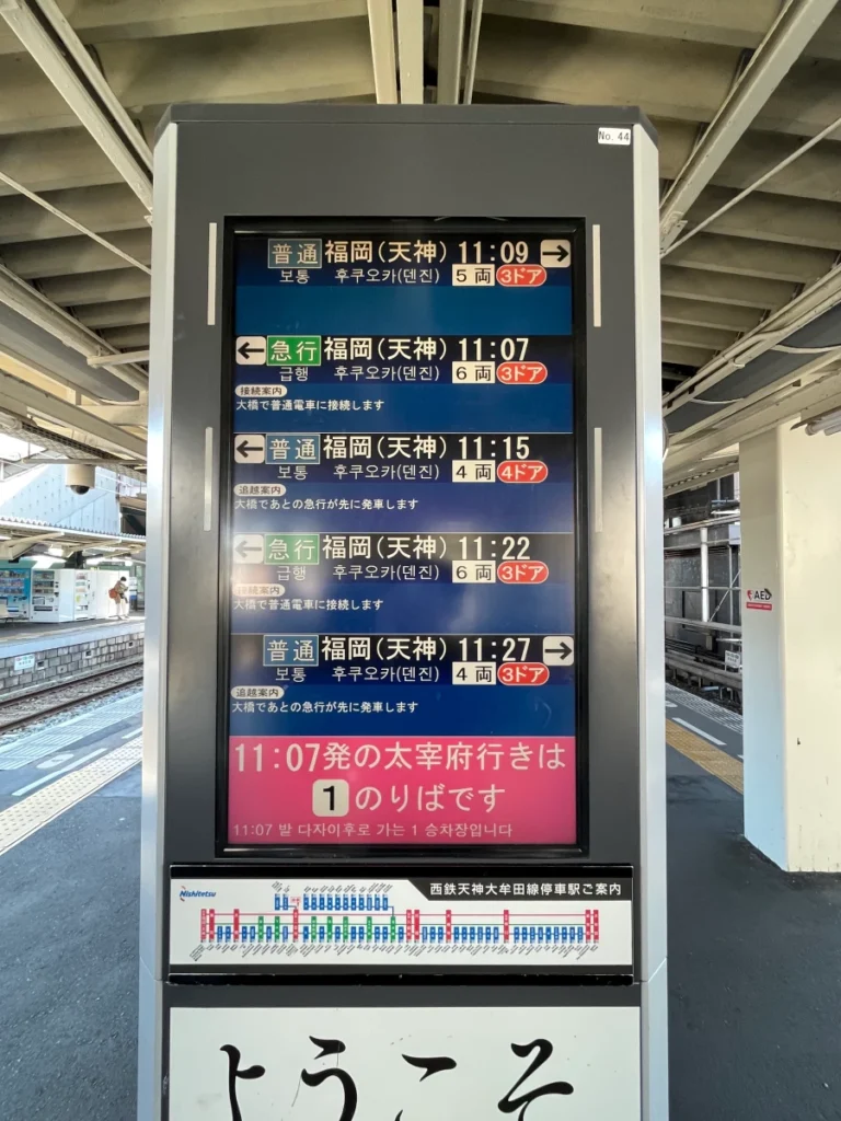 다자이후로 가는 급행 열차라 다자이후까지 환승 없이 갈 수 있어요.