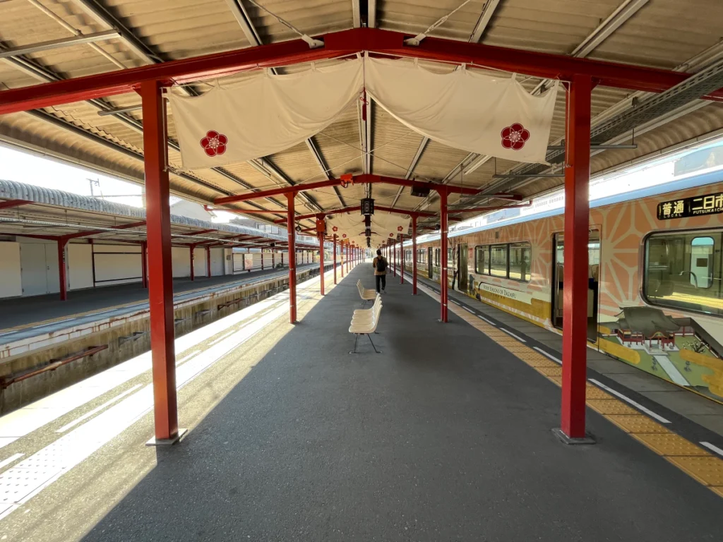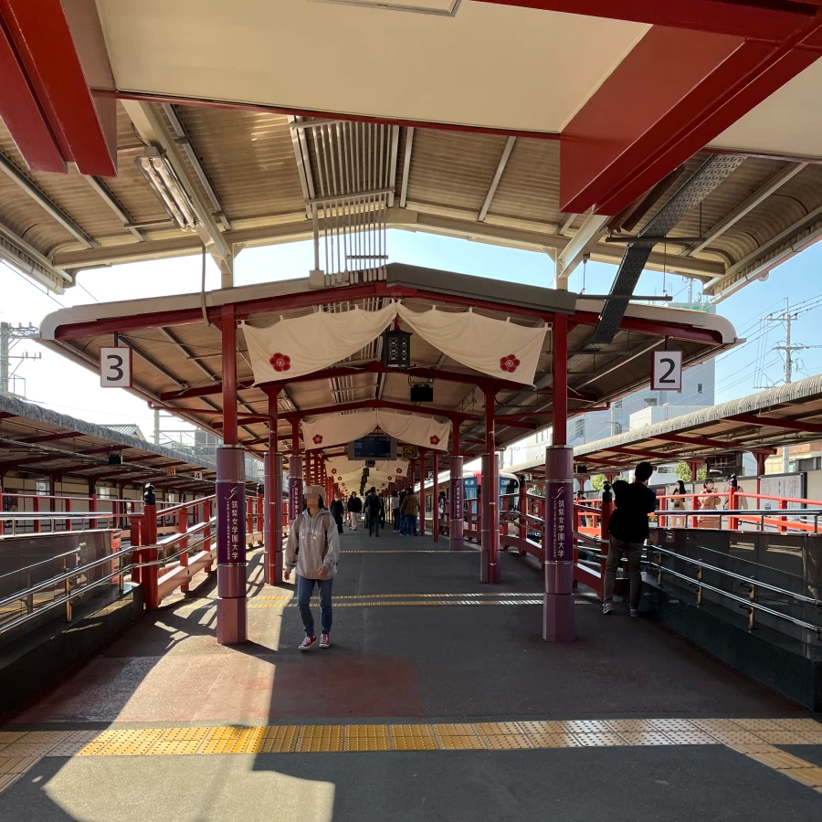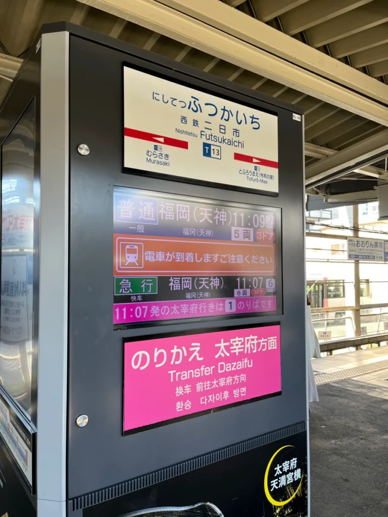 다자이후까지 가는 열차가 아니라면 니시테츠 후쓰카이치역에서 내려 다자이후로 가는 열차로 갈아타야 해요.