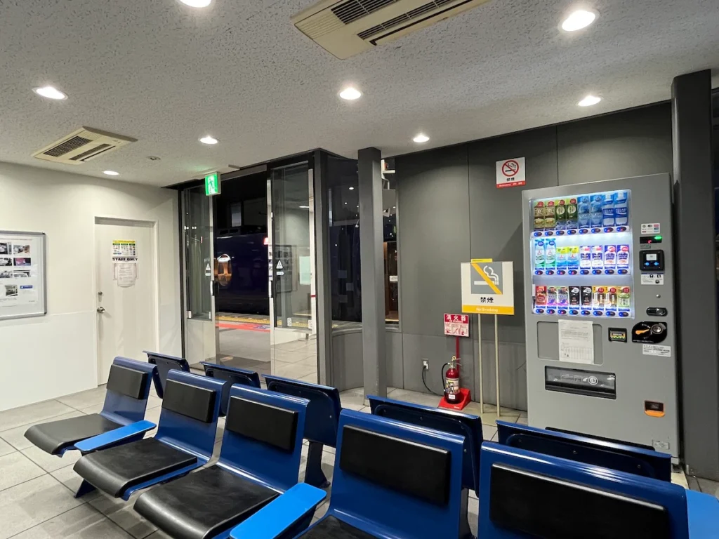 역 휴게실에 앉아서 열차를 기다려요.
