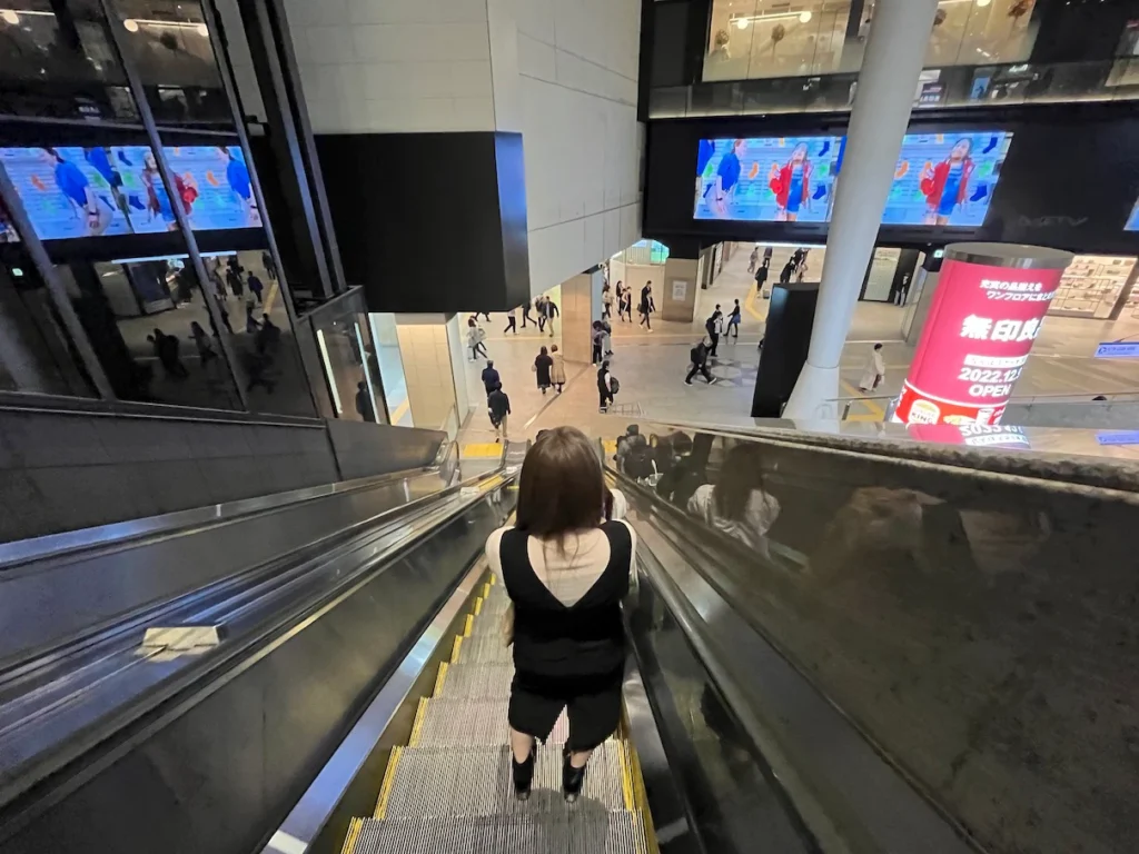 난카이난바역은 3층에 있어서 지하철로 환승하거나 나가려면 에스컬레이터를 타고 내려가야 해요.
