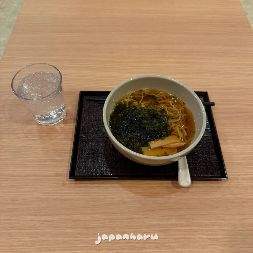 물을 한 잔 뜨고 줄을 서서 기다리면 간장라멘을 받을 수 있어요.