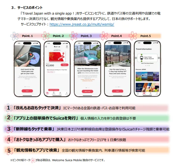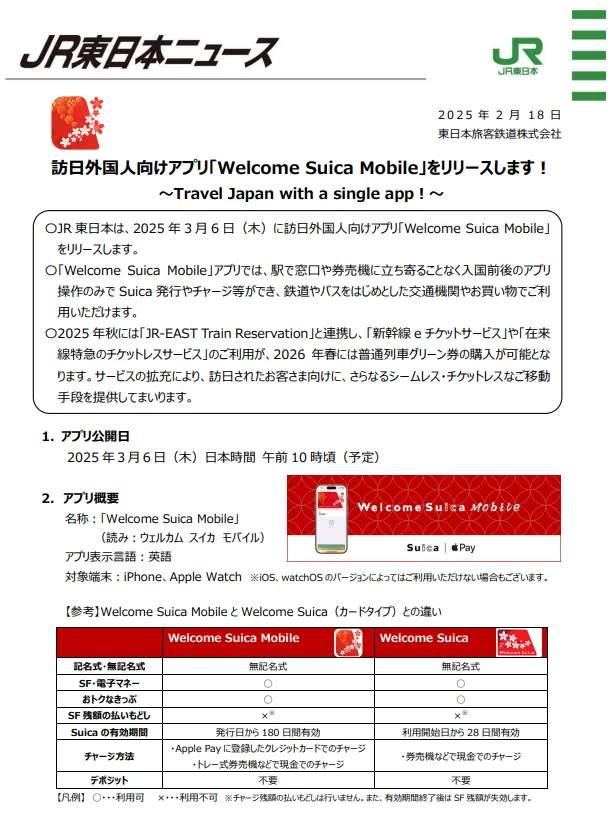 거기에 더해 같이 발표된 내용이 하나 더 있는데, 방일 외국인용 교통카드인 ‘웰컴 스이카’를 아이폰 앱으로도 발급해서 쓸 수 있게 하는 ‘웰컴 스이카 모바일’의 서비스를 개시한다고 해요.