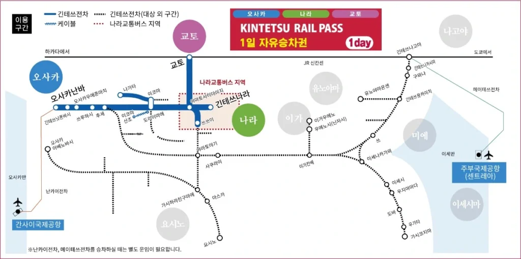 1일권은 아래 표시된 구간의 긴테쓰 노선과 함께 ‘나라 공원, 니시노쿄, 호류지 구간’의 나라 교통 버스를 이용할 수 있어요!