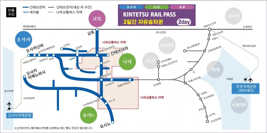 2일권은 아래 표시된 구간의 긴테쓰 노선과 함께 ‘나라 공원, 니시노쿄, 호류지, 아스카, 무로, 야마노베노미치 구간’의 나라 교통 버스를 이용할 수 있어요!
