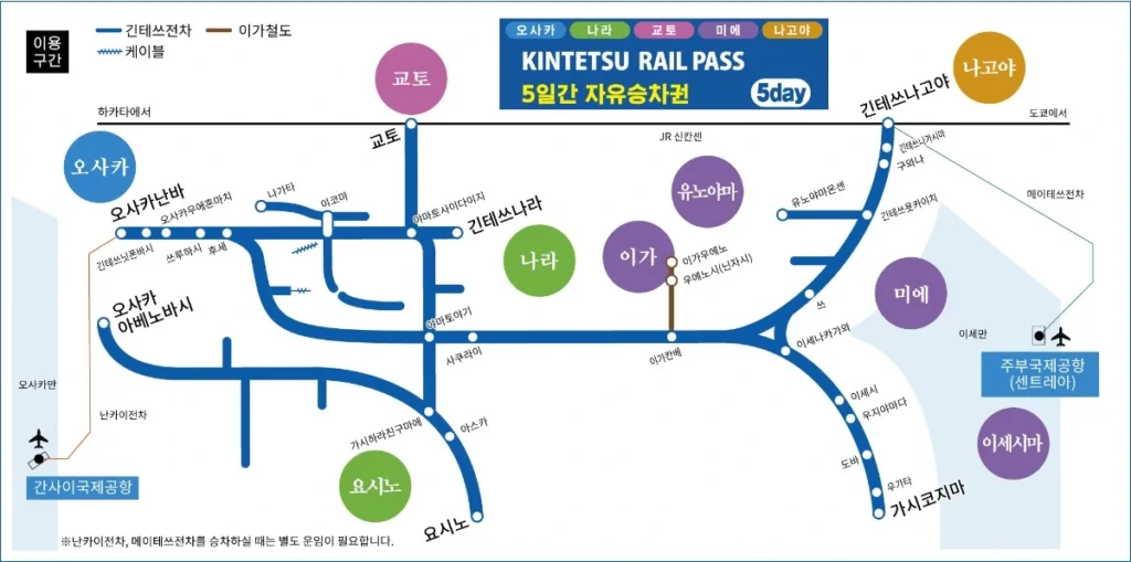 5일권은 긴테쓰 전체 노선과 이가철도 전 노선을 이용할 수 있어요!
